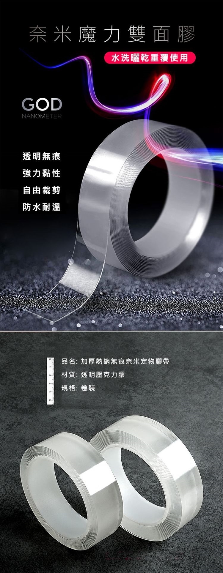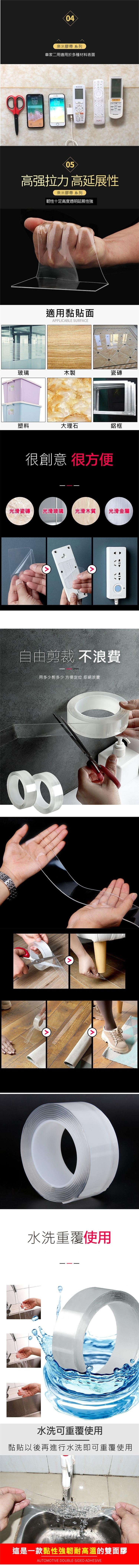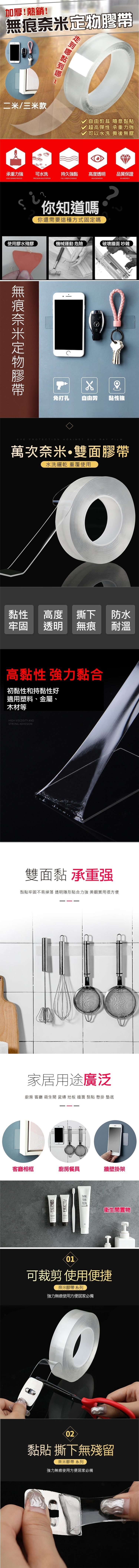 全新奈米科技!加厚熱銷無痕奈米定物膠帶  完全取代手機懶人支架還可以收納居家,黏貼一切小物的萬用膠帶,不管你走到哪貼到哪~可取代掛勾,或用來固定傢俱,撕下來絕不殘膠!奈米級黏性絕不給你的牆面找麻煩,最驚人的是,它用水清洗就能無限次重復使用!透明無色,無懈可擊!兩種尺寸任選!
