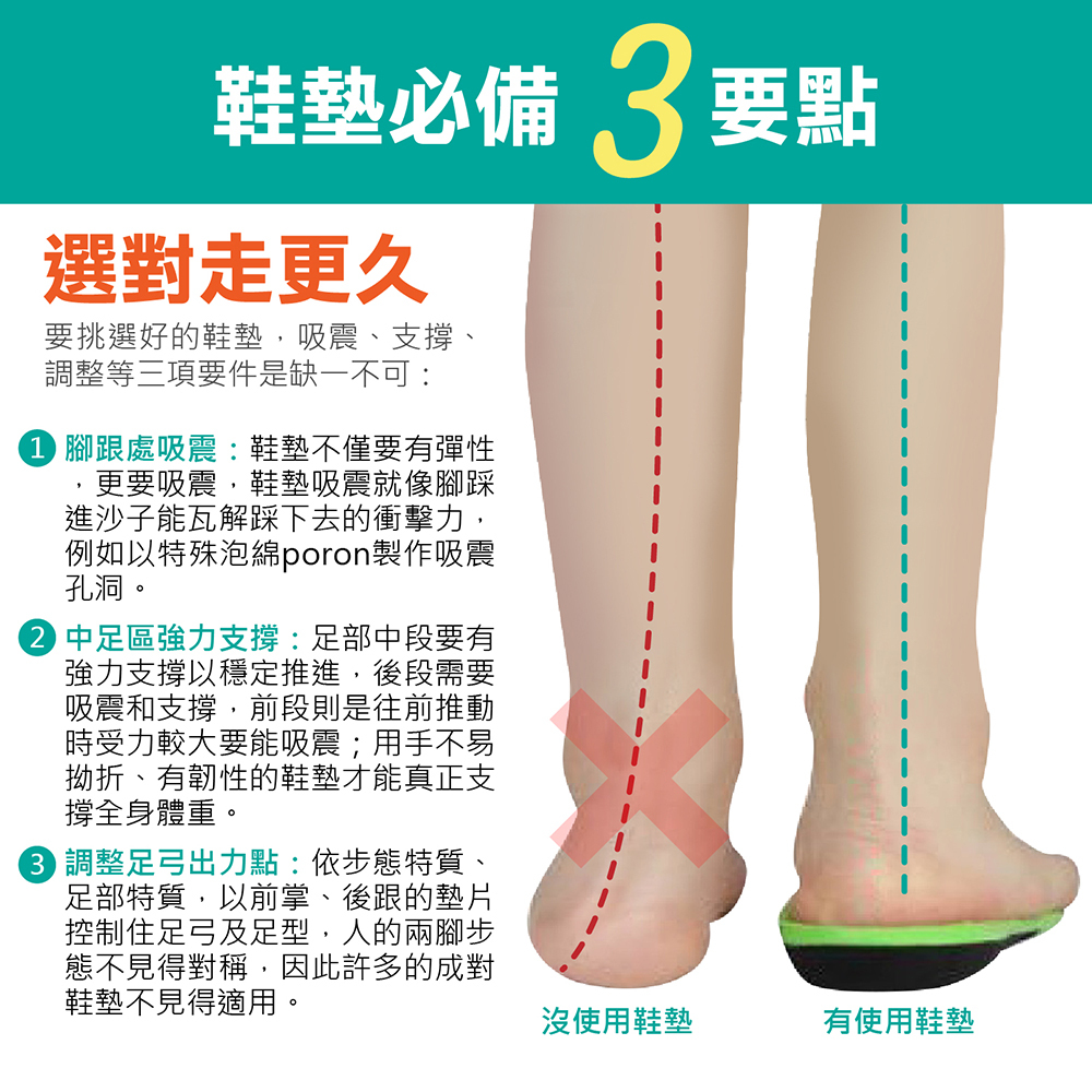 🔹前掌、足弓、后跟 足弓三點力學,使足部處於中立穩定狀態使用與足弓壓力導致疼痛,行走身姿有問題的人群