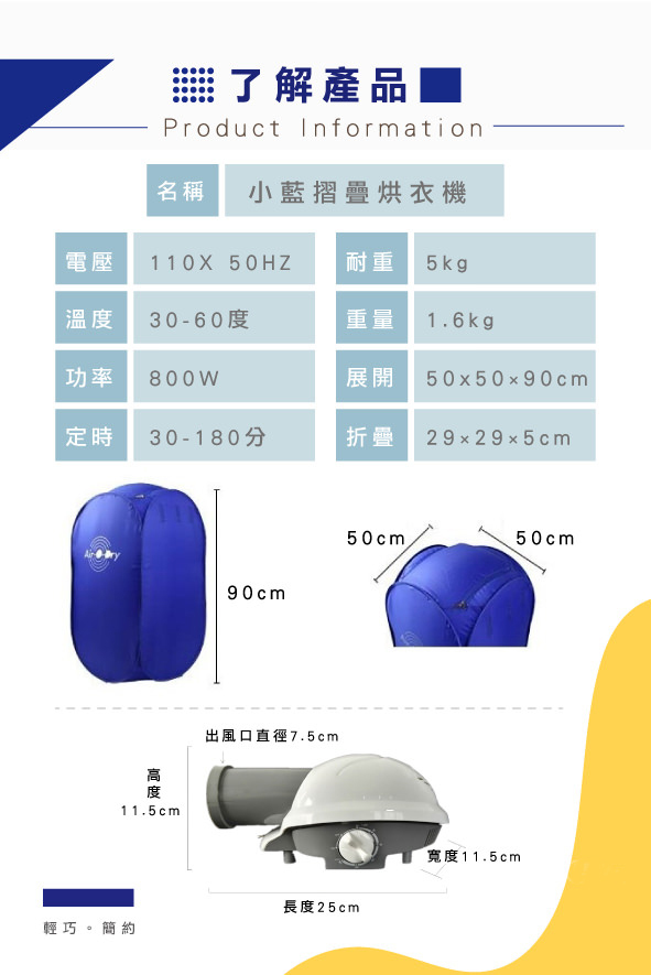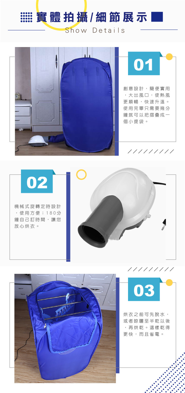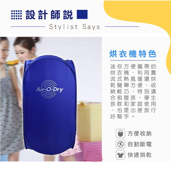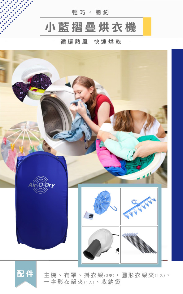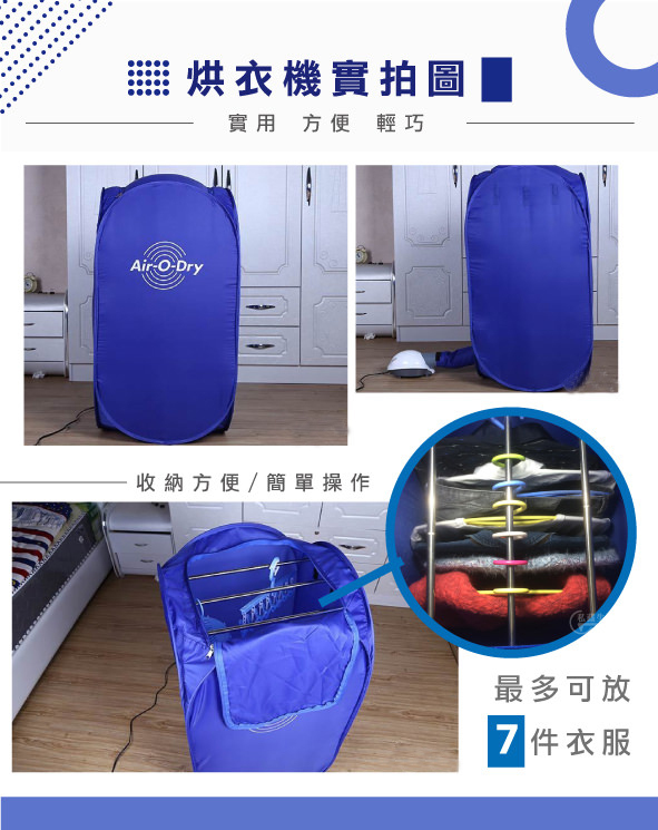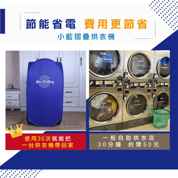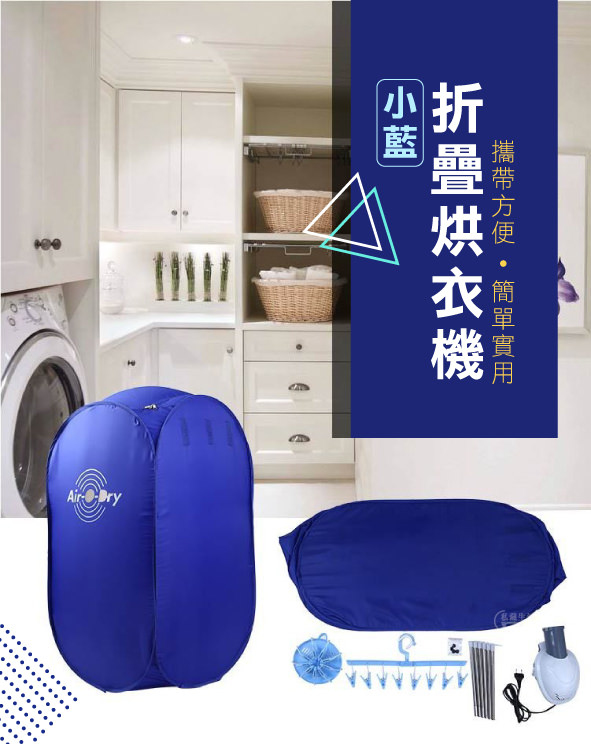 想拒絕臭味,緊係想令衫褲鞋襪快快乾透,沒有太陽曬乾,便自製快速乾衣的環境。「小藍MINI」摺疊烘衣機定能幫你解決眼前煩惱。設有定時器乾衣時間只需20~60分鐘。體積小、重量輕、易裝卸方便出外使用。