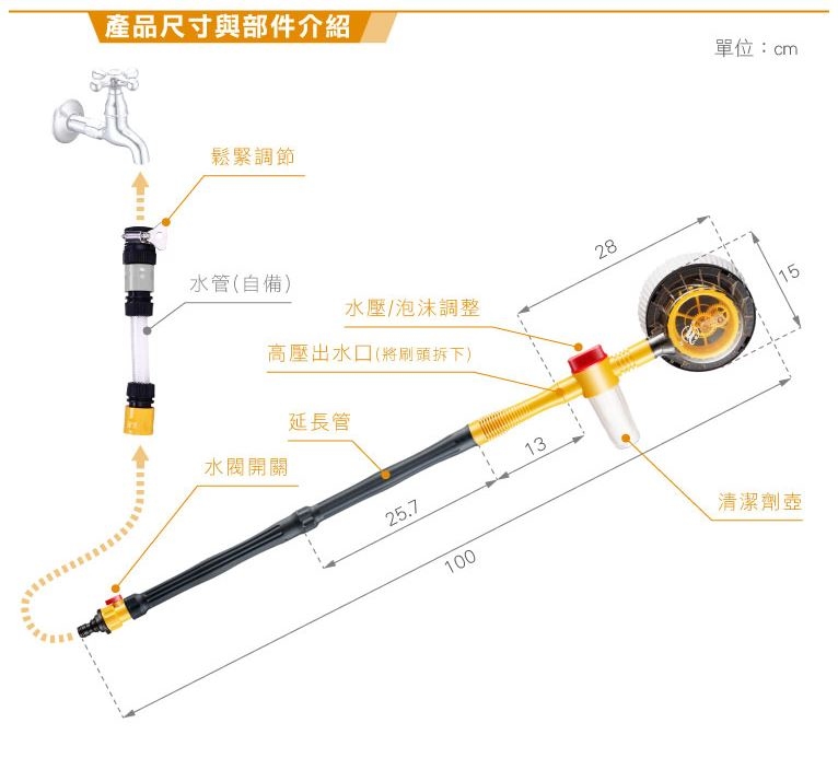 無須插電,水壓驅動內圈雪尼爾絨布自動旋轉!洗、沖、刷,三合一省時省力省荷包,洗車不必三頭六臂!清潔劑壺,刷頭自動導入清潔劑產生泡沫,水花不飛濺輕鬆洗、樂趣多,不傷烤漆、不傷玻璃,煥然一新!優質防滑手柄,握感舒適,符合人體工學!水龍頭接頭,進水口閥門開關,簡易拆裝不鬆脫!洗車、澆花、洗窗、洗牆、洗地無所不能!