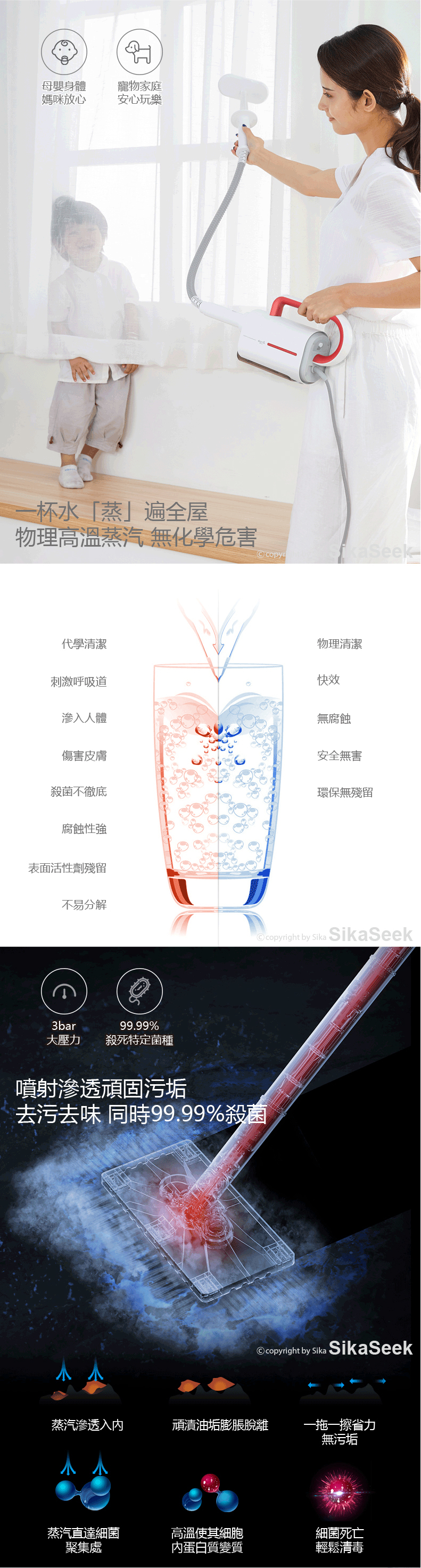 利用高壓蒸氣有效溶解表面頑固污漬及進行深層清潔,徹底消滅細菌, 無需使用清潔劑,無需過水,適合環保理念,避免過敏