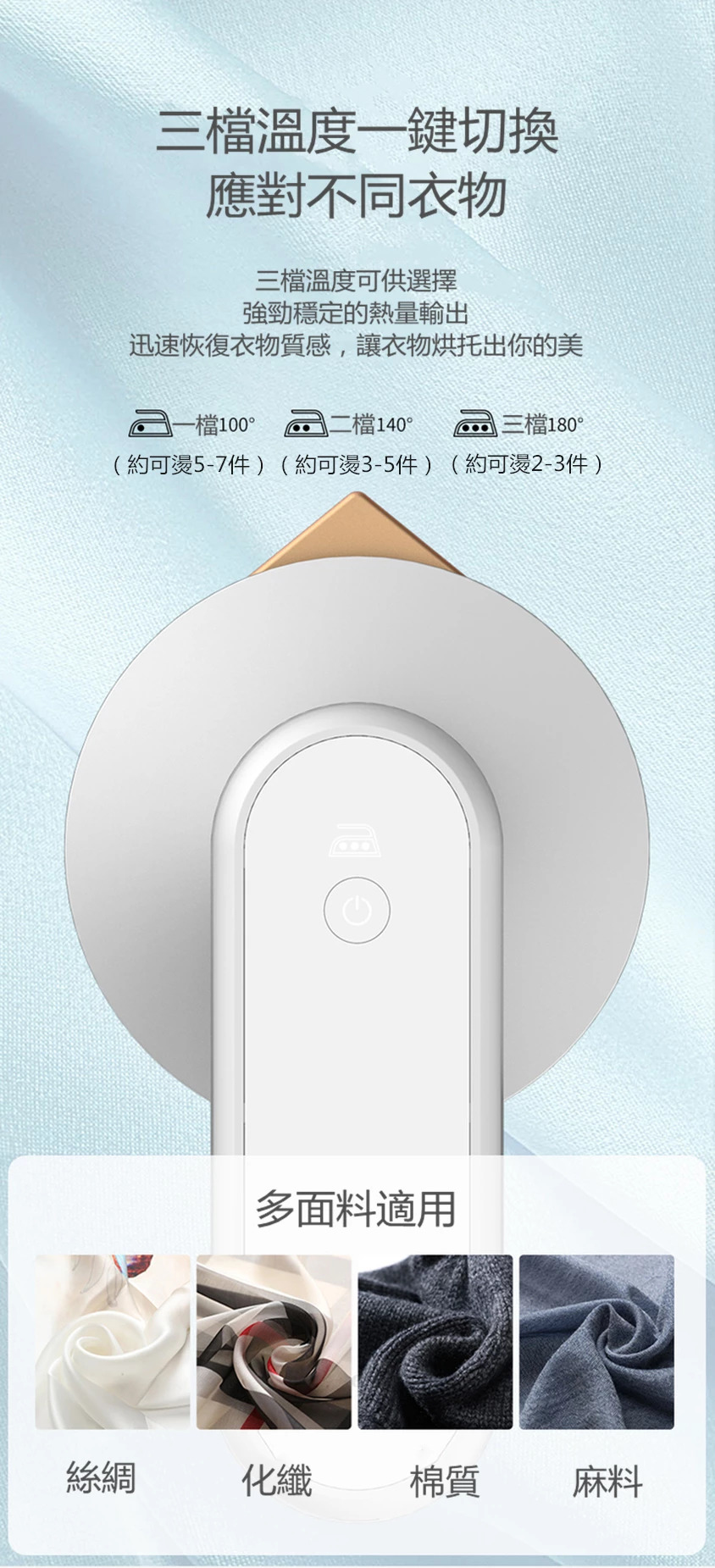 3檔180℃:適合較硬、較厚實的材質,例如麻料、牛仔等。