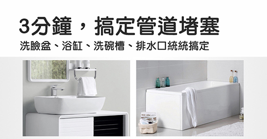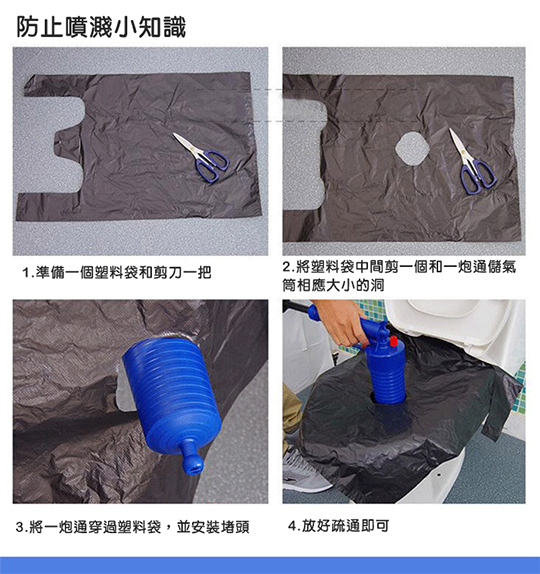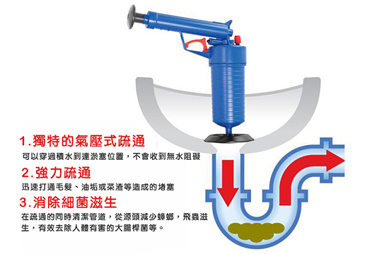 利用高壓氣體的原理,靠氣壓一次疏通管道內堵塞物,管道堵塞再也不必求人,女生也可輕鬆上手!毛髮、布屑、茶葉、菜葉、油垢等造成的堵塞都適用!居家比較容易堵塞的便是浴室(毛髮)以及廚房的排水孔(油垢),而這些都可以利用【通渠小綱炮】全能通氣壓式管道廚廁疏通器輕易地獲得解決!