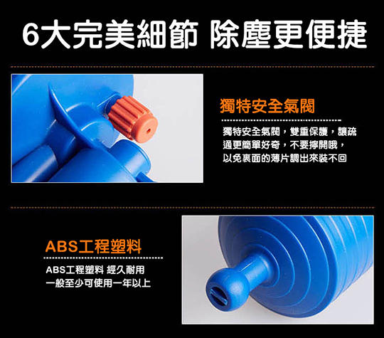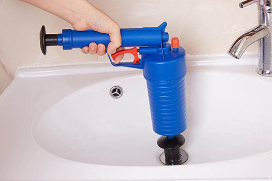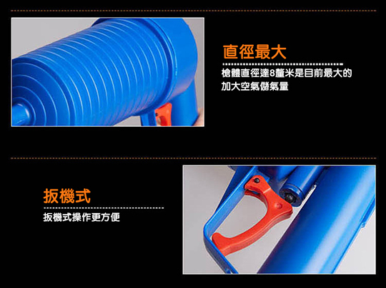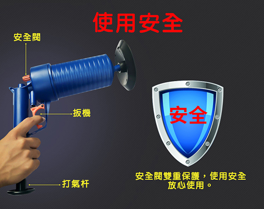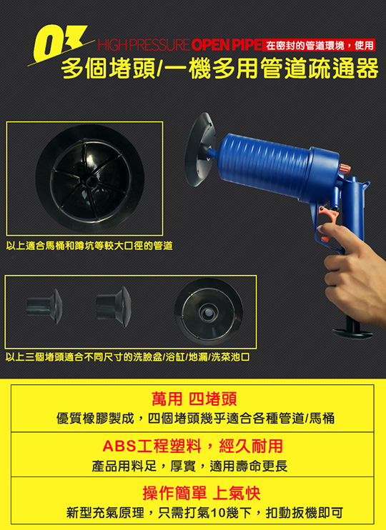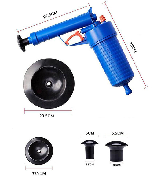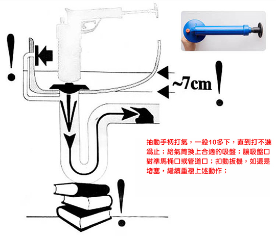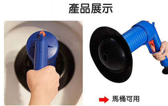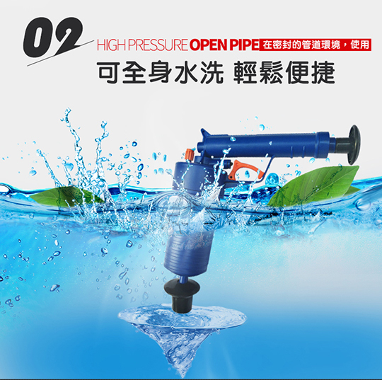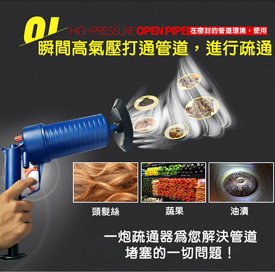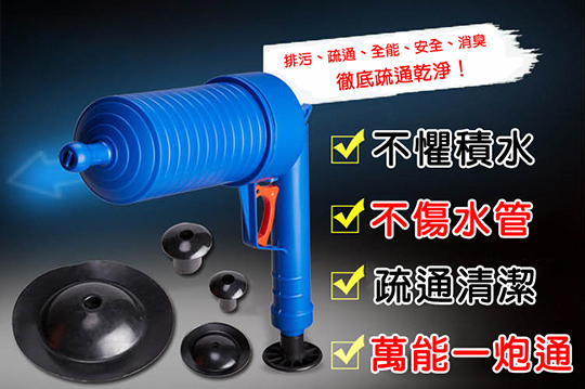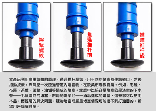 本次商品利用高壓氣體的原理,透過推杆壓氣,用不同的「堵嘴」蓋住管道口,然後扣動扳機,靠氣壓一次疏通管道內堵塞物,在歐美很暢銷唷!
