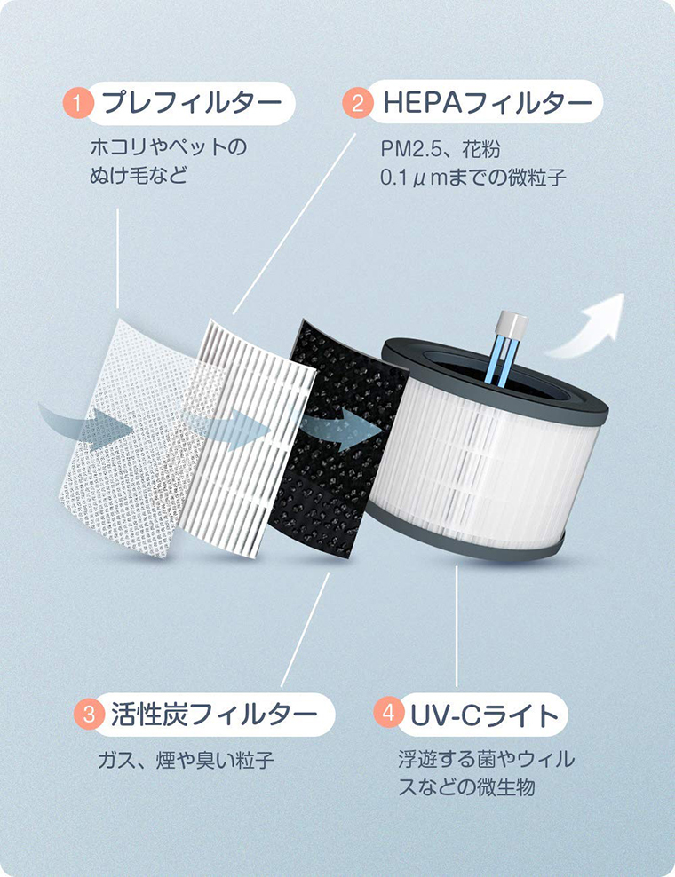 包括預濾網、HEPA 過濾網、活性炭除臭過濾網、UA燈