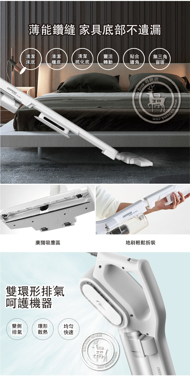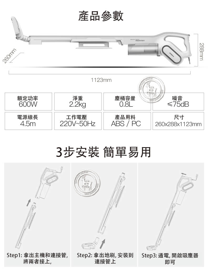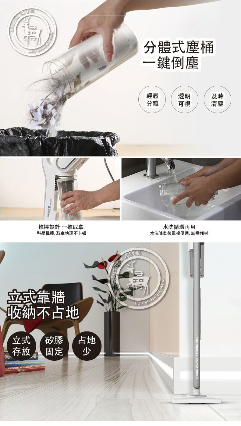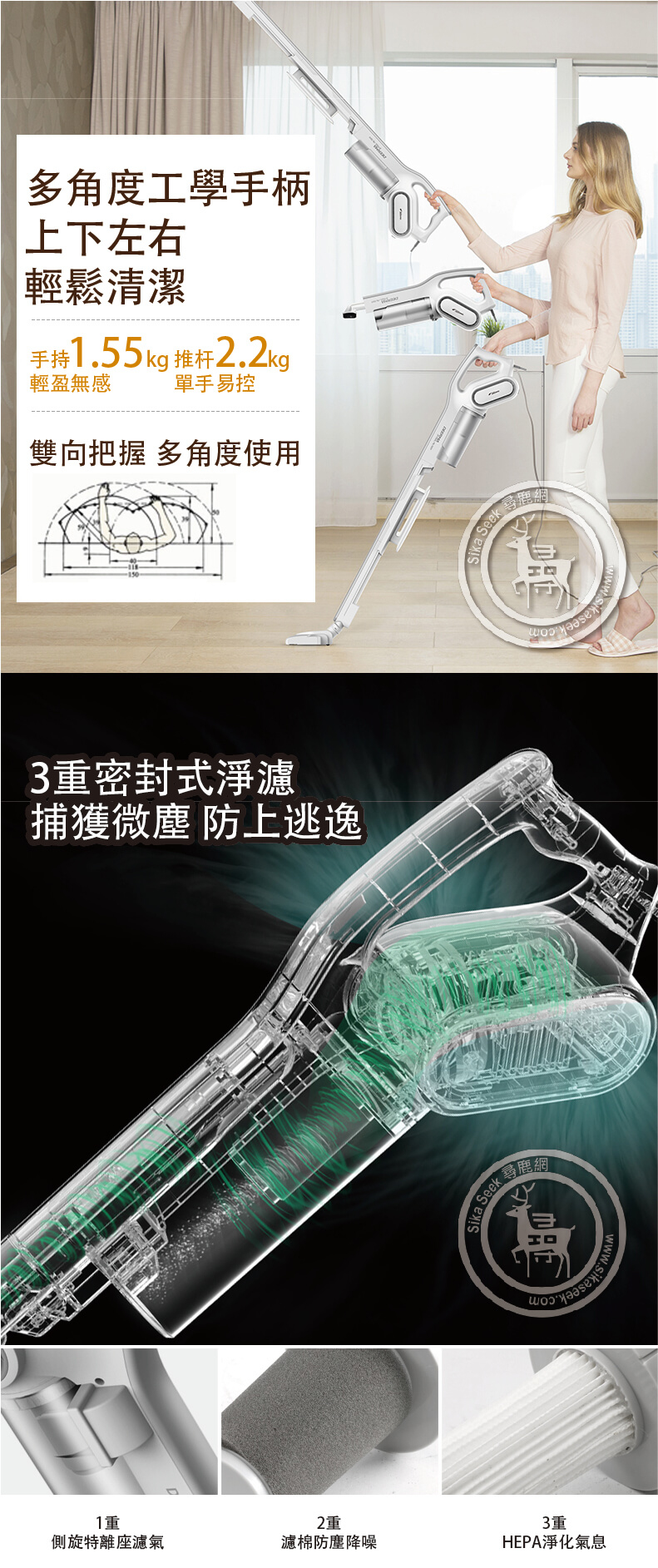 2.2KG輕巧機身,最適合長時間使用,可掛牆擺放 !多角度旋轉刷頭可靈活轉向,就算是較難清潔位置,都可以輕鬆打掃 !HEPA過濾網有效隔絕塵蟎及過敏原,減低因過敏而引發之疾病 !不需塵袋,易拆式可用水清洗設計,方便清潔及日常保養!