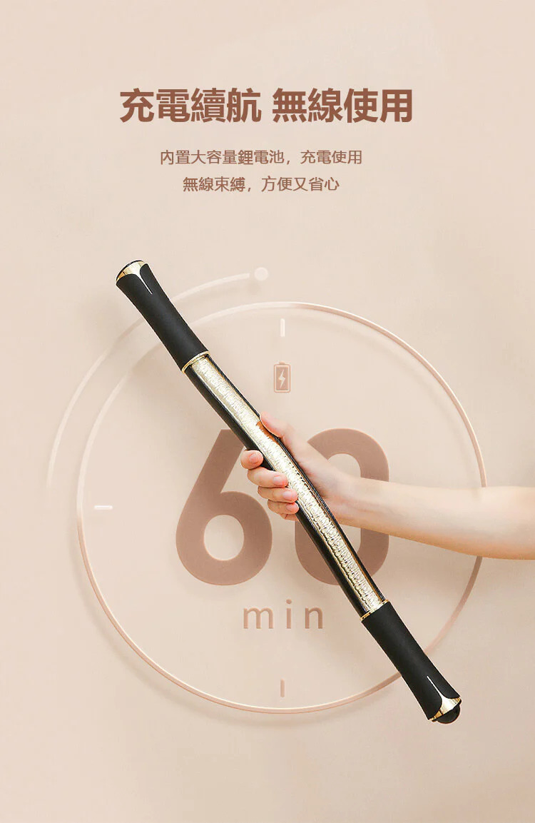 放鬆肌肉,促進消化,增強抵抗力產品名稱:電動擀筋棒供電方式:充電式工作電壓:5V額定功率:5W充電時長:2個小時左右續航時間:1小時左右