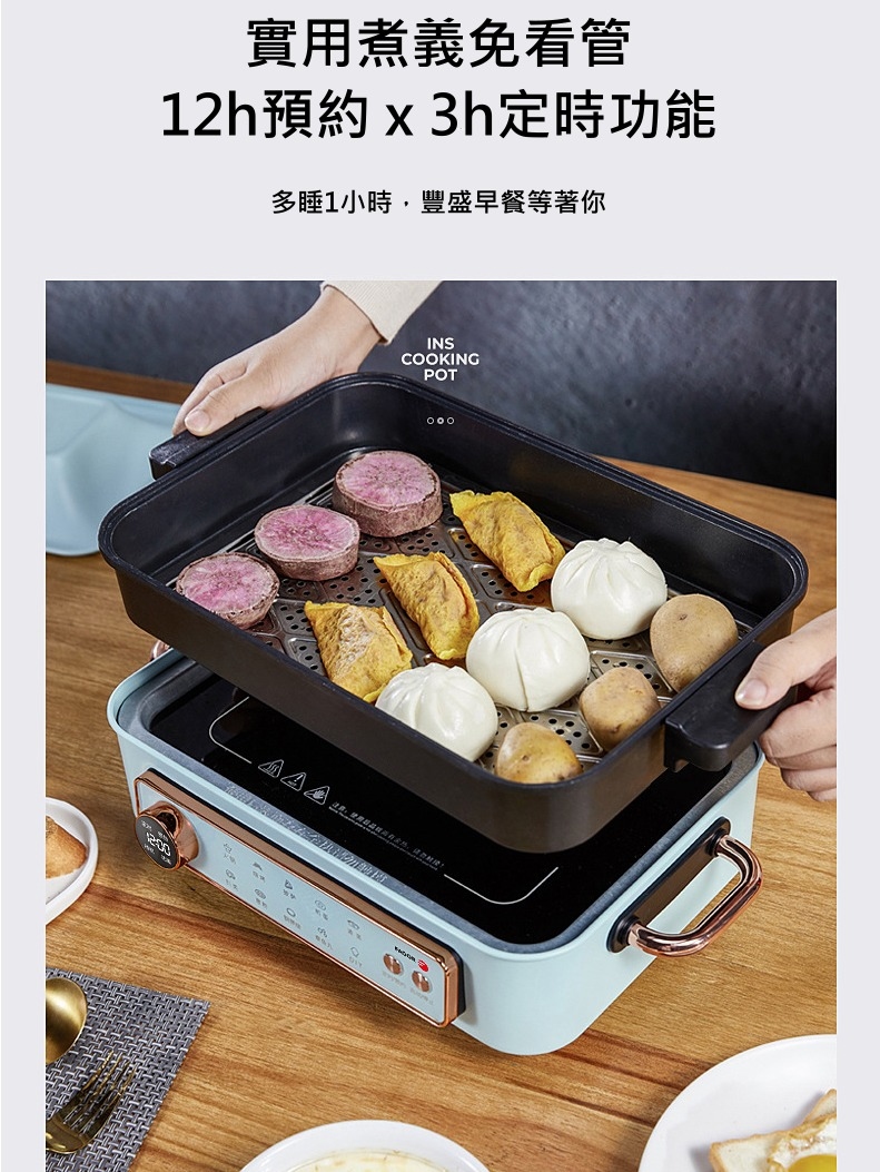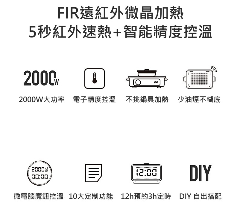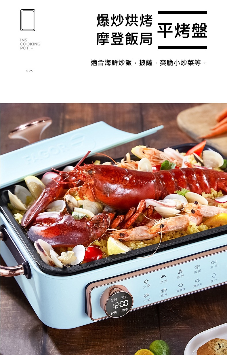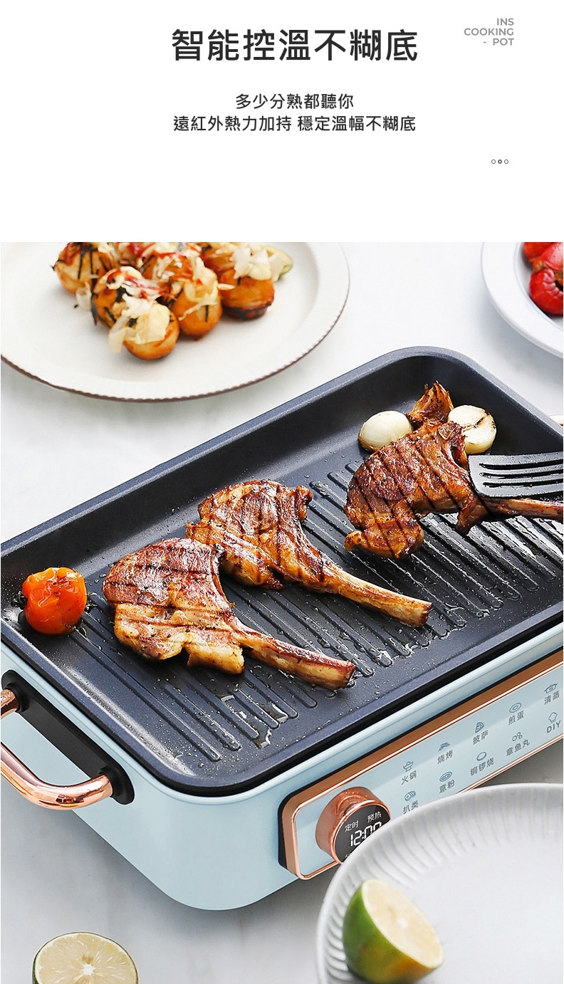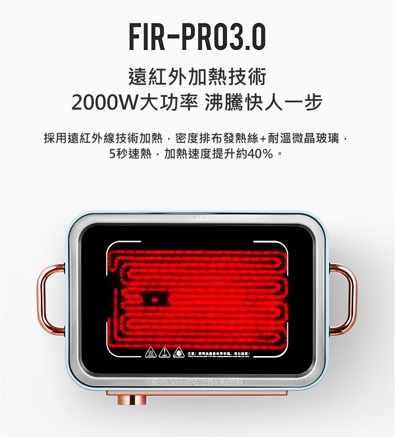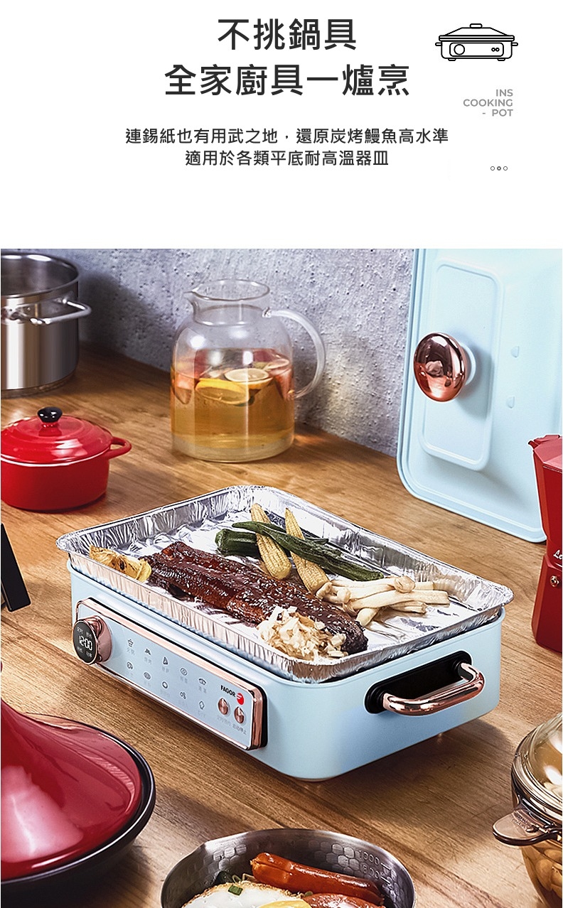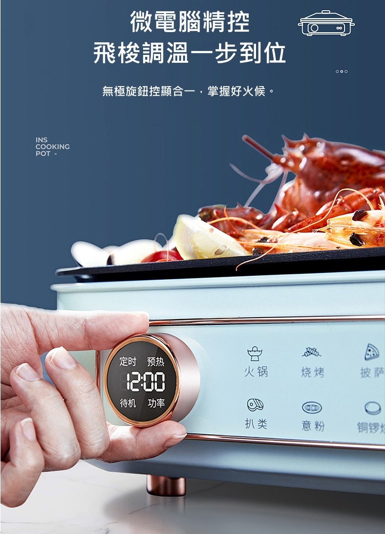 "火鍋+蒸+燒烤+煎+炒+煮+燜"一爐搞定。FIR遠紅外微晶加熱,5秒速熱,更適用於各類平底耐高溫器皿,錫紙都用得。智能精度控溫,2000W大功率,12h預約+3h定時功能。六大配件可選,不粘易潔烤盤。香港13A三腳插。天藍色,紅色,粉紅色三色可選。