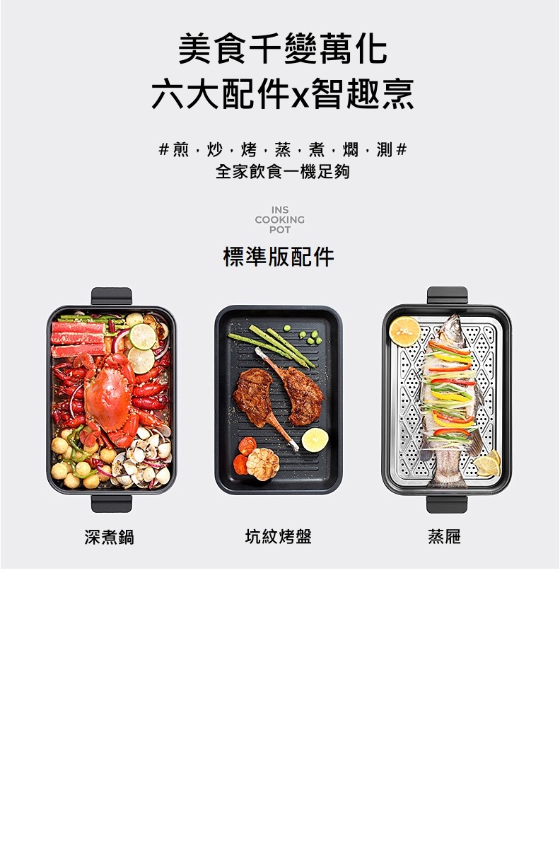 標準版包含:主機,深煮鍋,坑紋烤盤,蒸屜,電線,說明書
