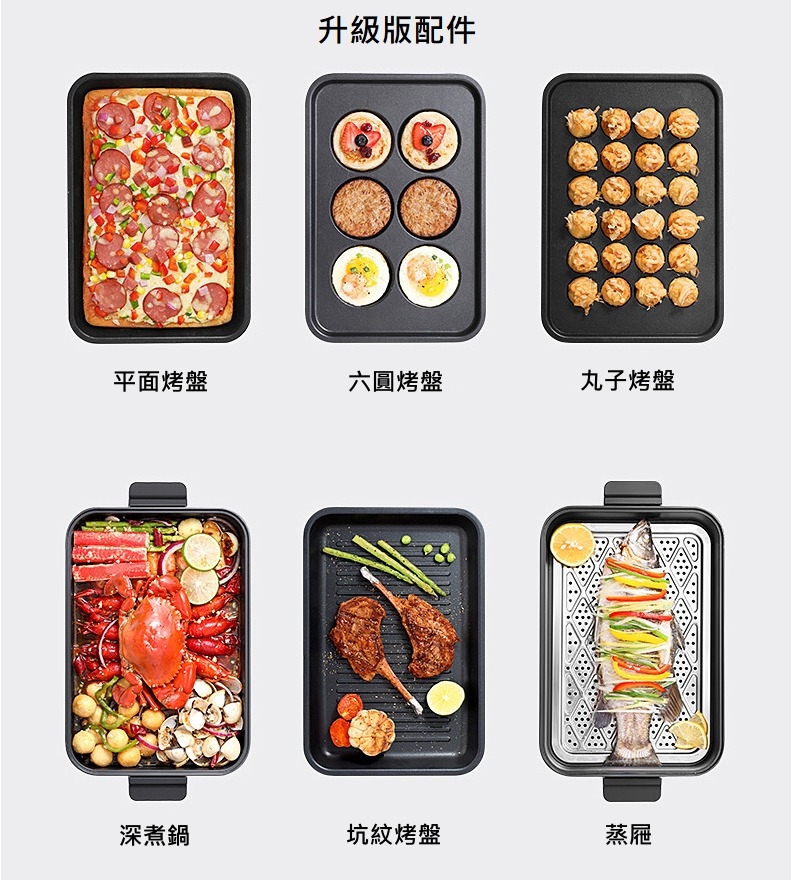 升級版包含:主機,平面烤盤,六圓烤盤,丸子烤盤,深煮鍋,坑紋烤盤,蒸屜,電線,說明書