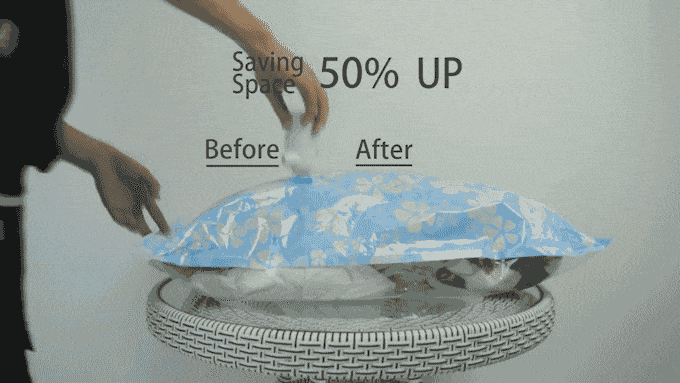 • 同樣大小的行李箱,通過使用我們的真空袋,可以節約50%的置物空間,能夠讓你回家的時候帶更多的東西!