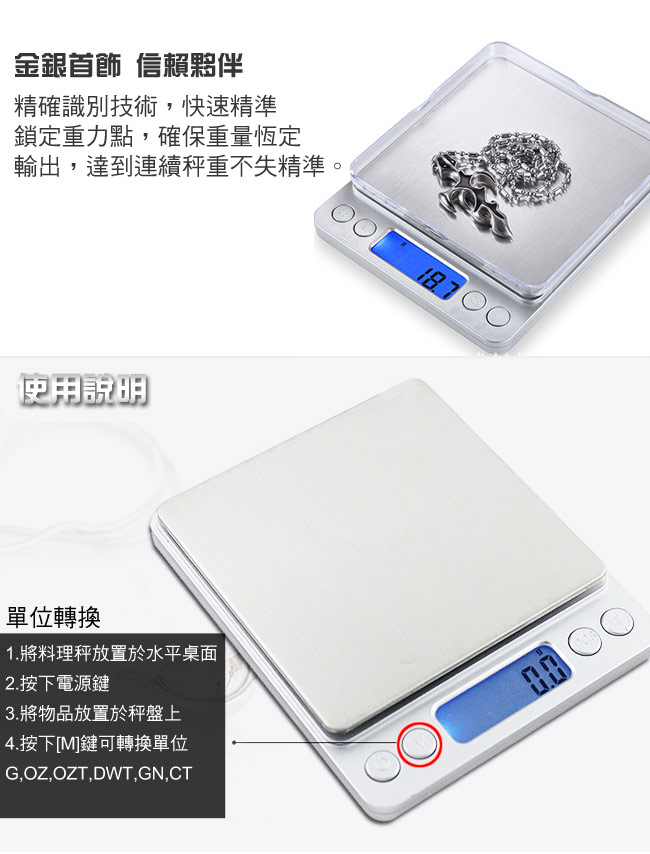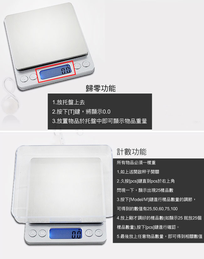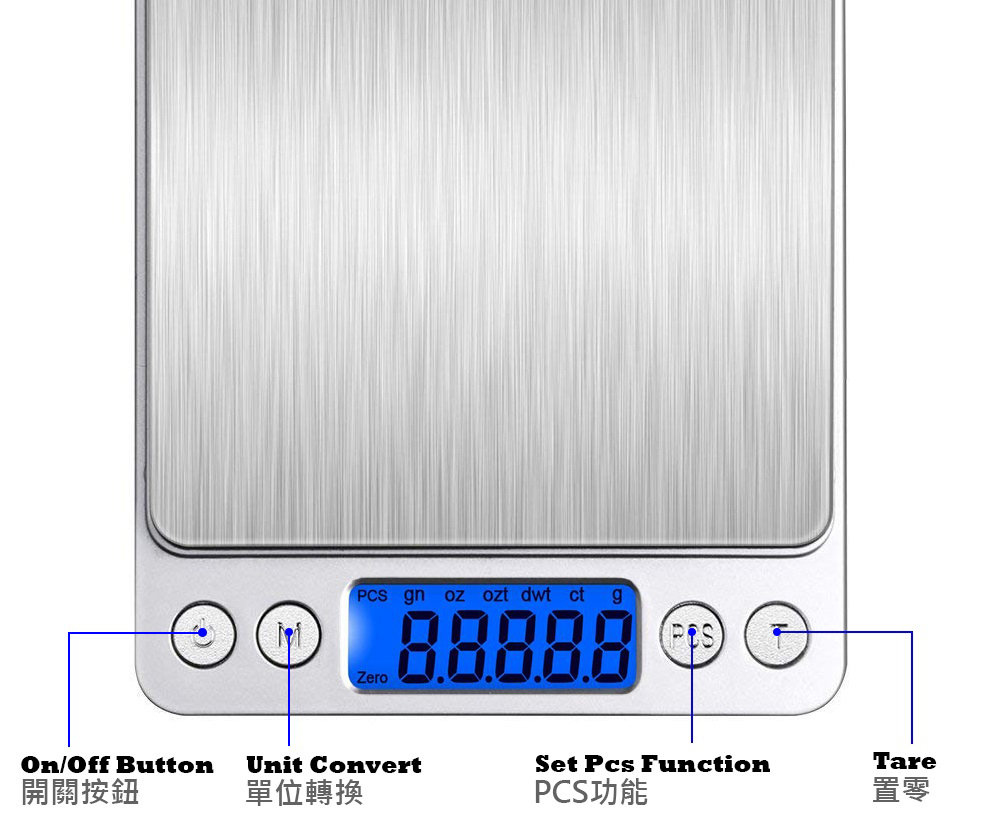 • 多功能:“PCS”功能可以讓您計算件數,如針,珠,螺絲;  “T”功能可讓您在碗或其他容器中測量食物;
