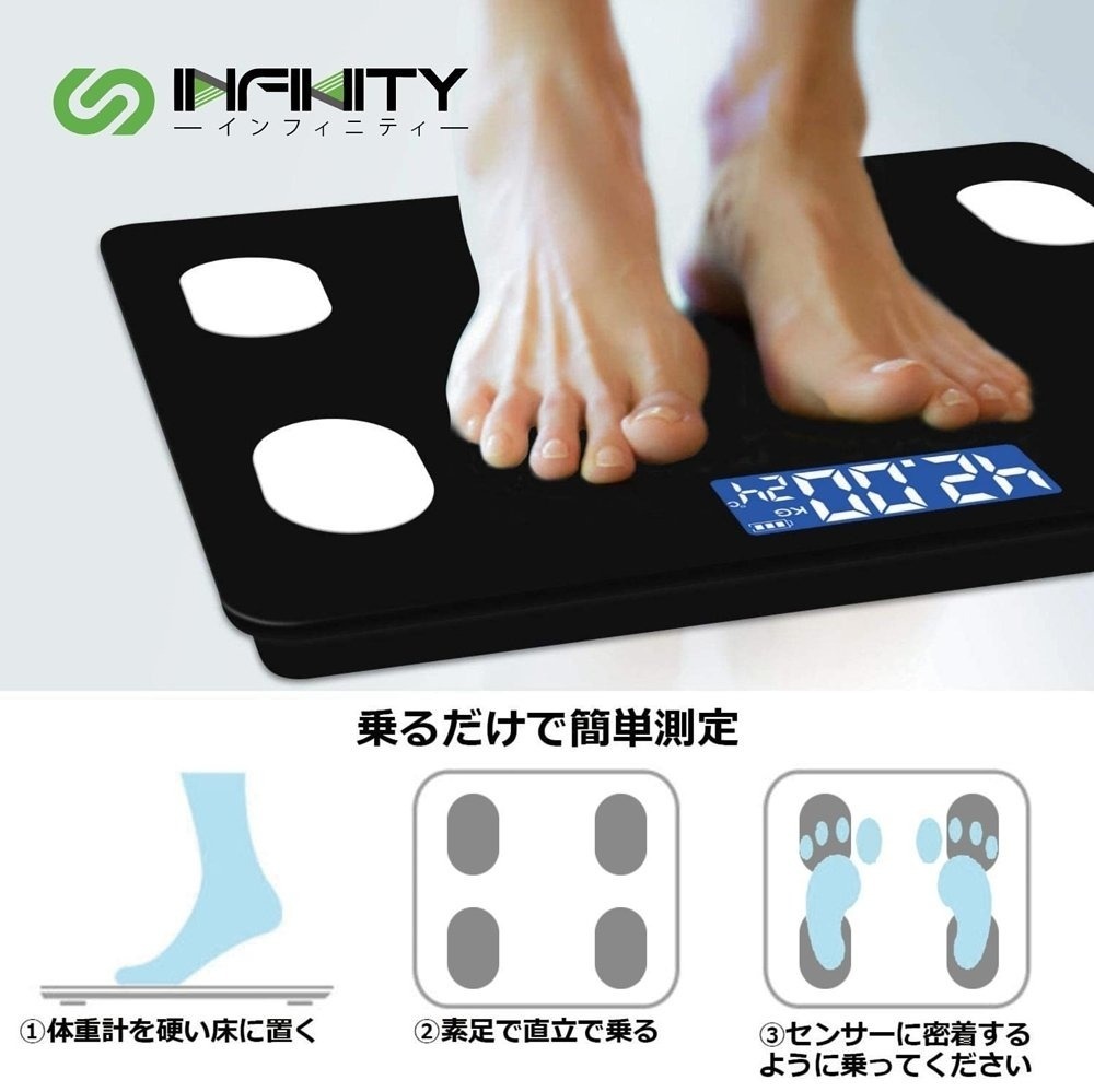 • 可查測12種指標:體重、體脂、BMI、水份、肌肉比率、骨重比率、基礎代謝率(BMR)、內臟脂肪、淨體重、體脂重量、骨重量、肌肉重量