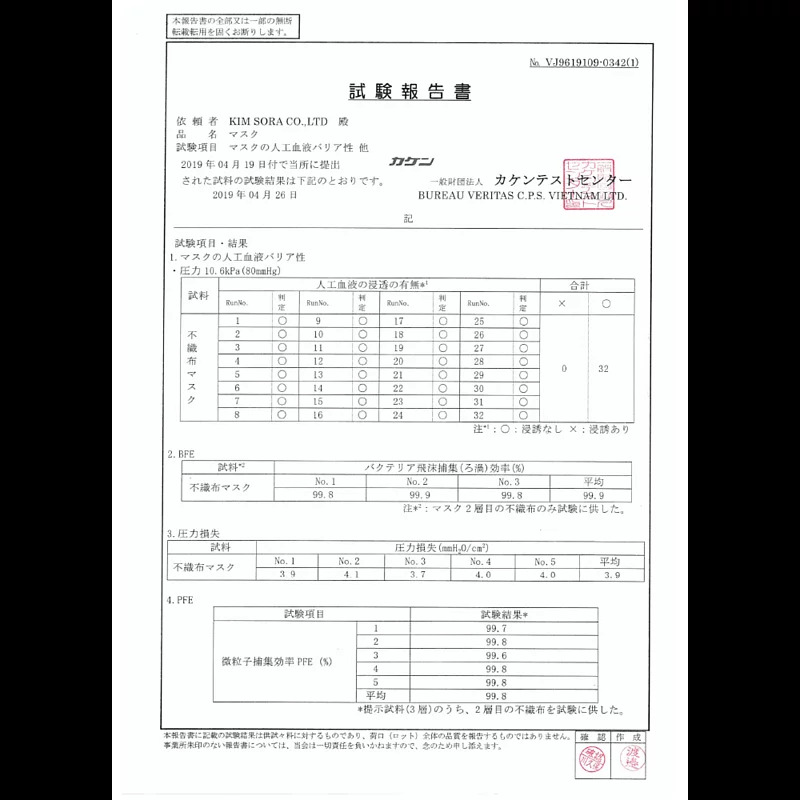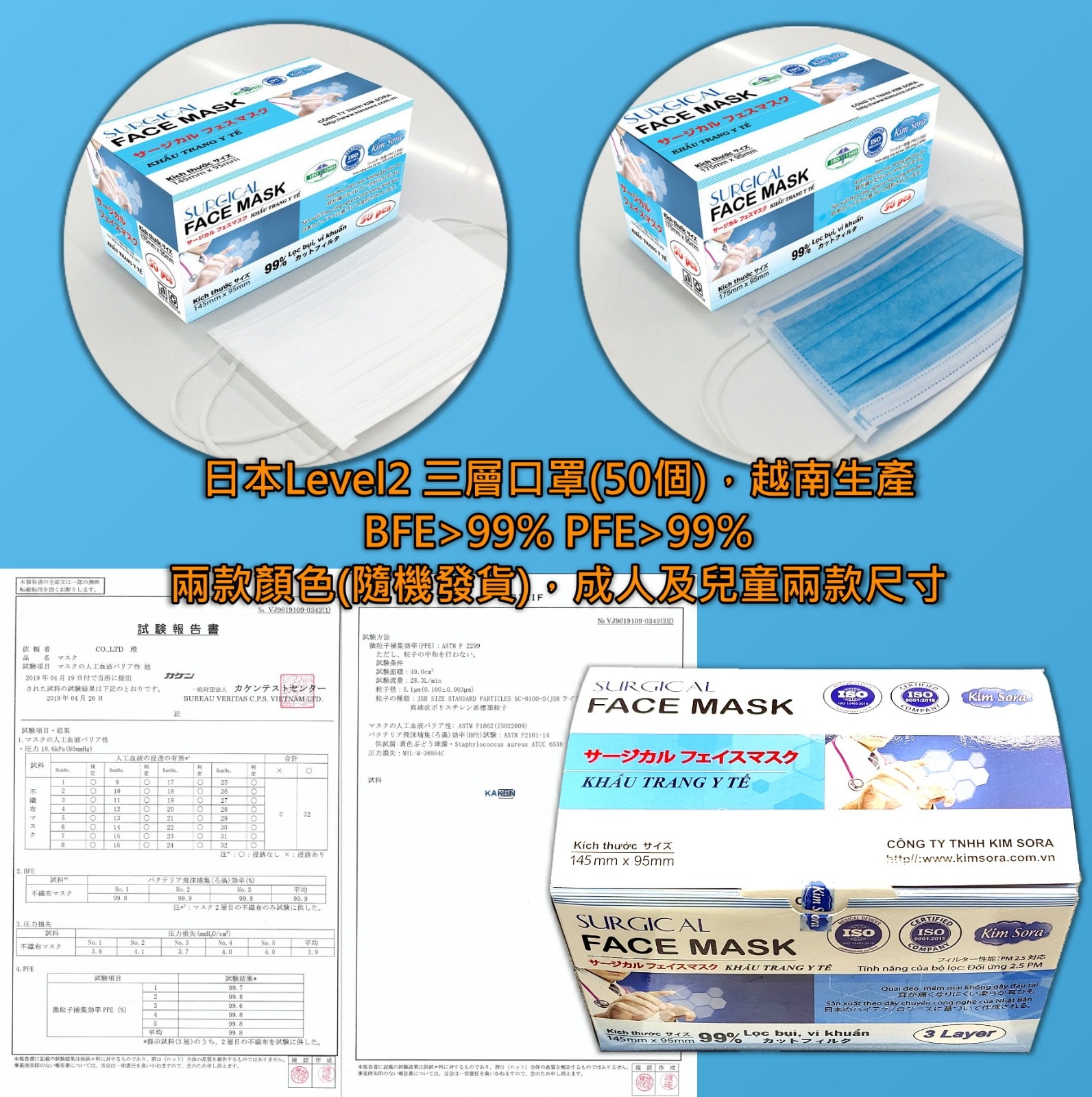 日本Level 2 BFE>99% PFE>99% 三層口罩丨國際認證機構認證丨越南生產丨顏色隨機