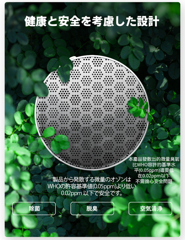 • 產品散發低於0.02ppm微量臭氧,比世界衛生組織要求0.05ppm為低