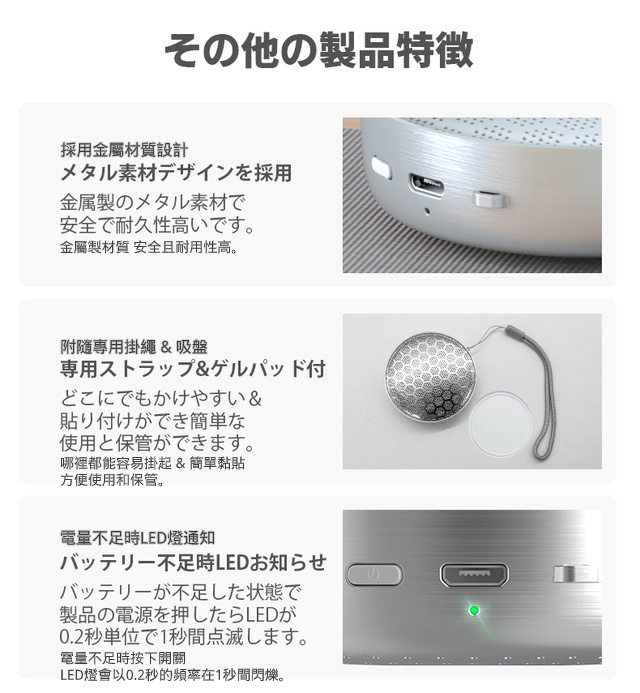 • 內置500mAh電池,USB充電,運作時有提示燈