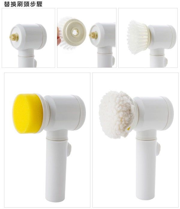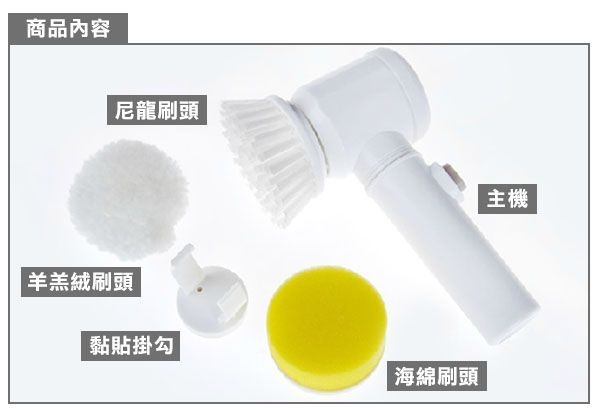 3款不同刷頭,清洗不同表面,無須人手洗刷,刷頭快速轉動,洗刷物件表面污漬!電池驅動,體積細小,方便收納!針對不同場合:流理台、窗戶、磁磚、浴缸、地毯、電器、家具、廚房油垢、縫隙污垢......經常性容易藏污納垢地方,都可徹底去除污垢,立即與髒污說Bye-Bye!