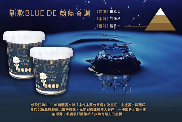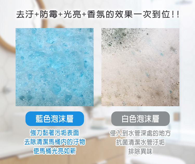 • 藍色泡沫可去污光亮,白色泡沫可防霉除臭,去汙+防霉+光亮+香氛的效果一次到位!
