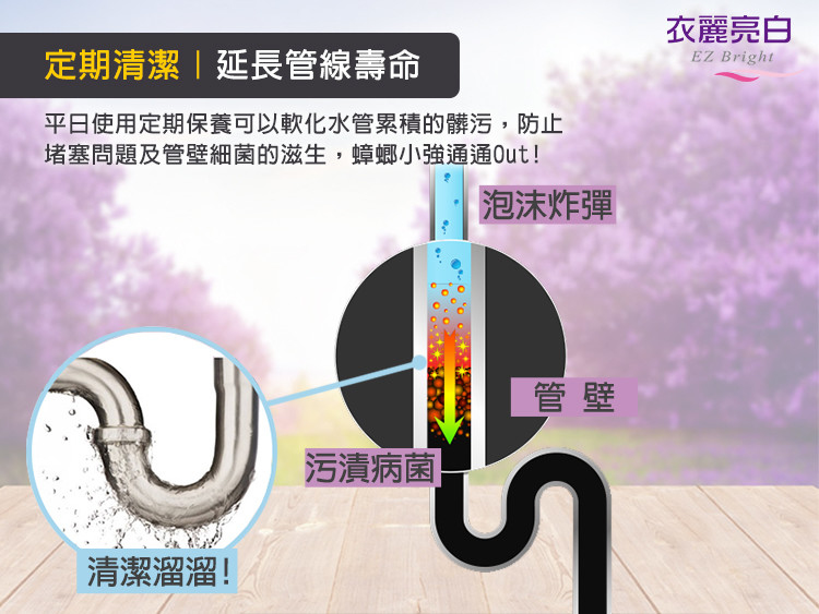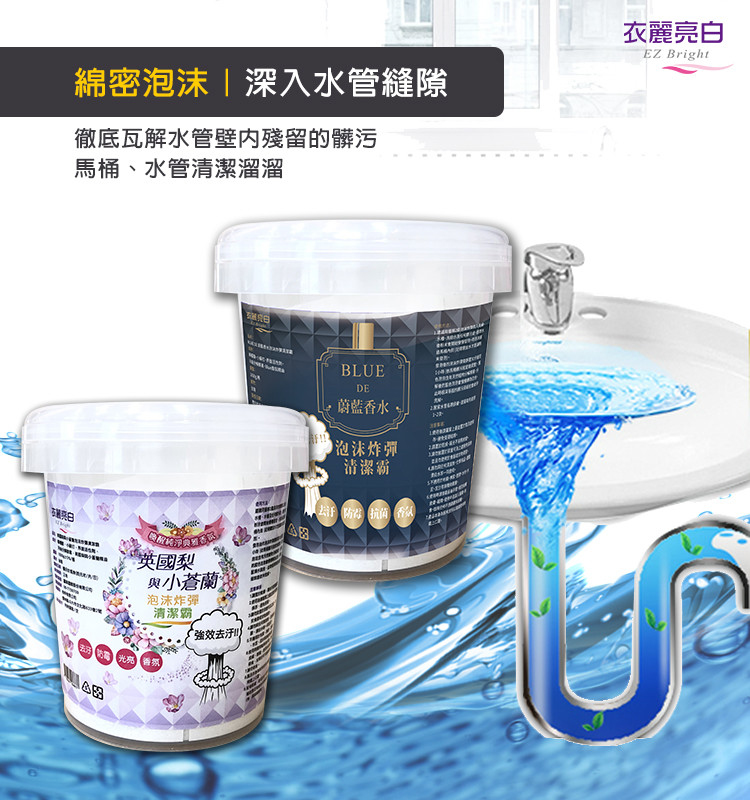 保養水管=保養房子的血管,只要有管道通通需要衣麗亮白泡沫炸彈清潔霸!透過活氧發泡洗滌技術,內含獨特香氛水解技術及高濃縮植物分解酵素,無論是清理水槽、洗臉台、馬桶、居家水管,皆可將汙垢帶走,去汙+防霉+光亮+香氛的效果一次到位,清洗後的馬桶就像汽車打蠟完的效果bling-bling,並且長效持續芳香!