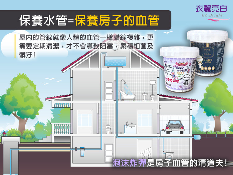 • 保養水管= 保養房子的血管,只要有管道通通需要泡沫炸彈清潔霸!