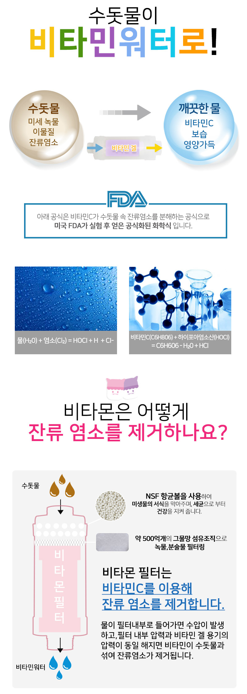 • 過濾器中的維他命C可清除淨水過程中所產生的氯殘留物,並轉化為潔淨水