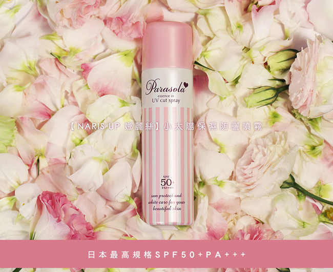 NARIS UP 娜莉絲保濕防曬噴霧,最高防曬指數SPF50+ PA++++,是含有6種保濕美容成份,包括:玻尿酸、膠原蛋白、高滲透型維他命C誘導體、Q10、氨基酸、神經酰胺(是無色透明液體,高效保濕劑,具有啟動細胞的能力,促進細胞的新陳代謝,促使角質蛋白有規律的再生),令肌膚強效防曬同時亦能護膚,打造夏季完美美肌。此產品是透明型,完全不泛白,因此不但能在肌膚上使用,也能噴在頭髮上。加上玫瑰花香的味道非常討好,在噴秀髮時不但起了防曬功效,同時還能去除頭發上沾染到的煙味及異味。噴霧型能夠輕鬆照顧到一般防曬霜很難塗抹到的地方,例如頸部、耳後部位,產品還能夠倒著噴,對背部及肩部也能輕鬆照顧到。而且在補噴防曬產品時也能隨時隨地使用。加上此產品無著色、不含防腐劑、礦物油,亦無需使用專用的卸妝產品,只需用回普通的洗面產品或沐浴乳清洗乾淨即可,方便易用!