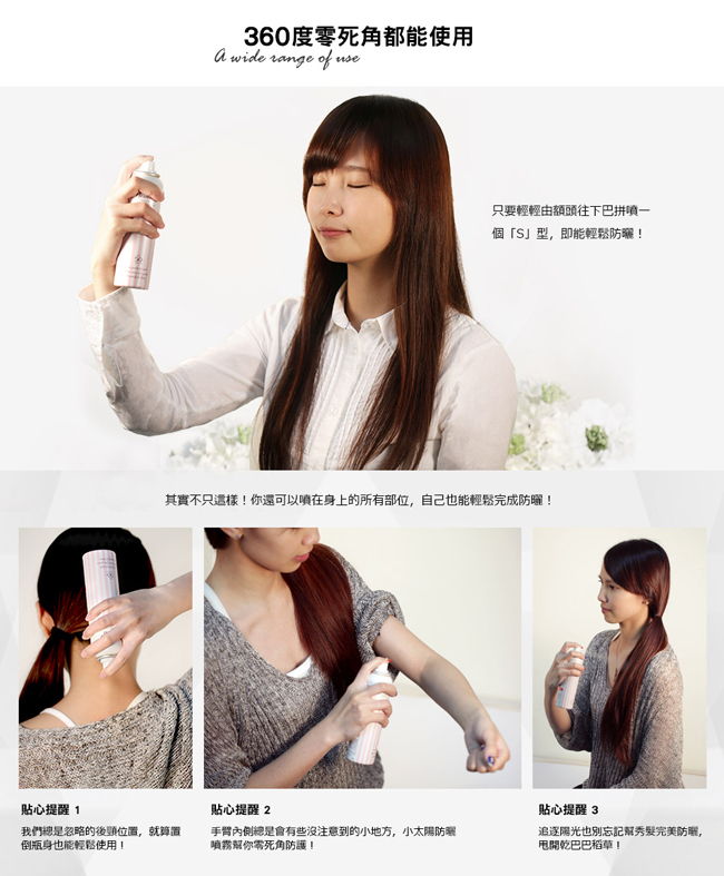 2. 離肌膚10 – 15公分,像噴霧似的直接對著想防曬的地方