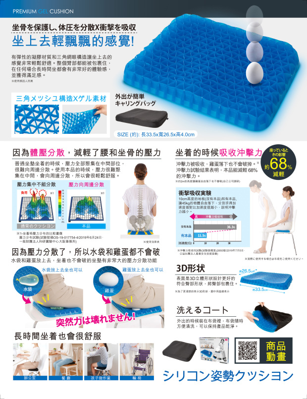 • 減輕坐骨神經痛、椎間盤突出、腰背痛坐下時痛楚