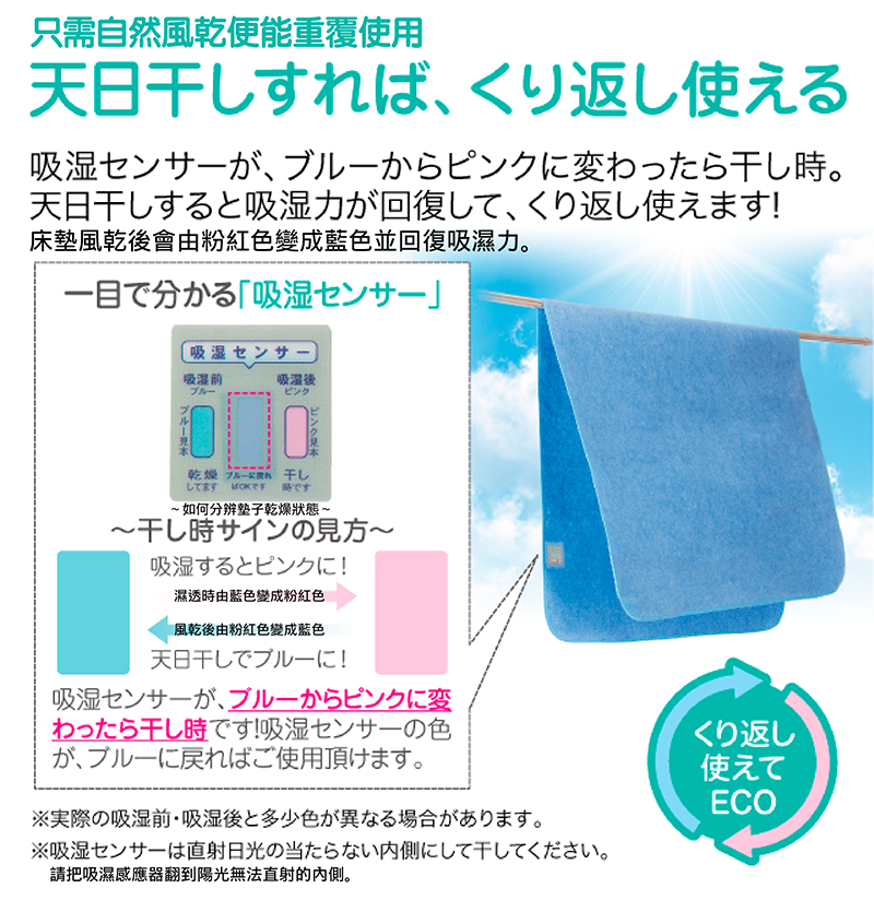 * 床墊風乾至正常濕度後可循環使用(感應器回復藍色),慳錢之餘又環保