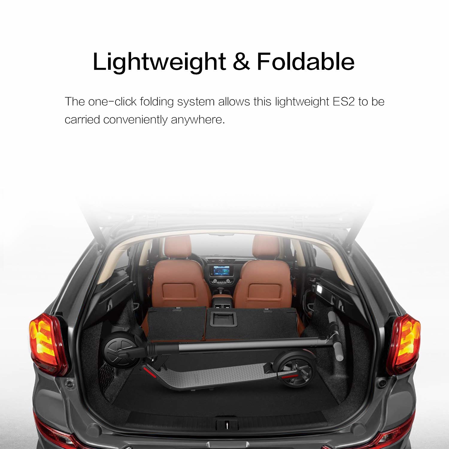 Ninebot 九號 Segway ES2 全能級電動滑板車,標準版可行駛25km,可加配擴充電池,續航最高達45km。一鍵折疊,輕鬆收納放進車尾箱,全身無外露走線,鋁空金車架,一體式折彎車架,時尚外觀。