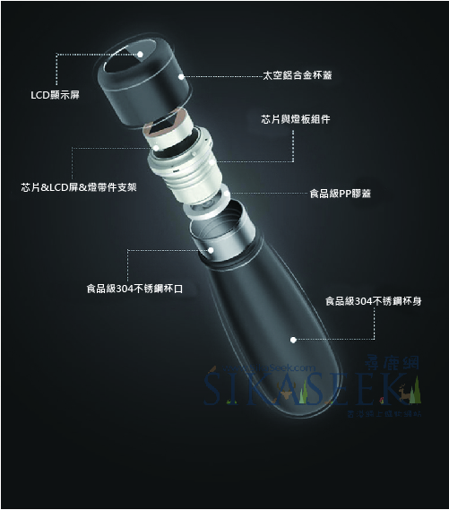 ● 一個觸控式的杯蓋,杯蓋採用鋁合金外殼,LED點陣屏和觸摸屏組件。