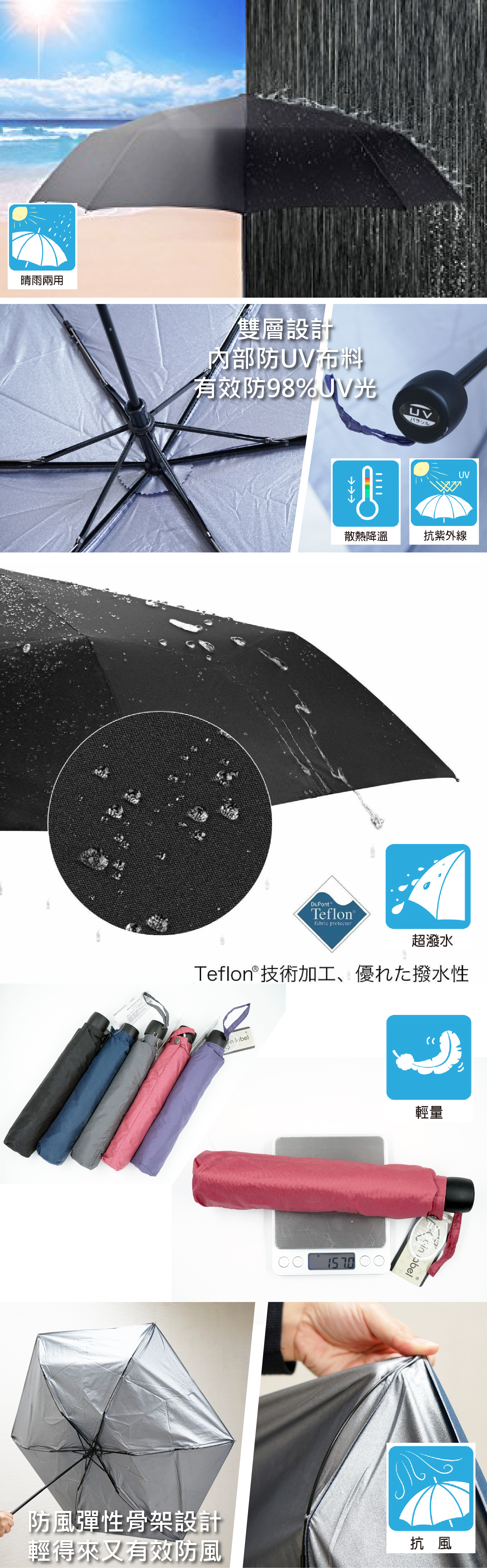 滴水不沾雨傘採用最新超撥水高密度納米傘布能瞬間抖掉水珠。雨傘使用後只需開收震動,傘面就不會有水漬,上車入室內不再濕答答,防 UV 98%以上。