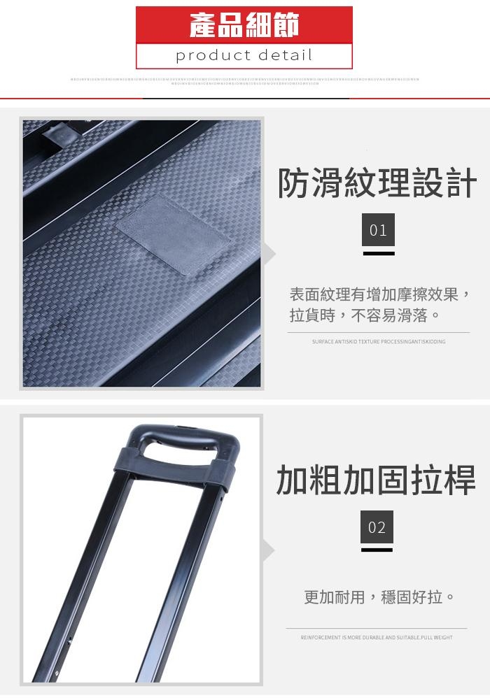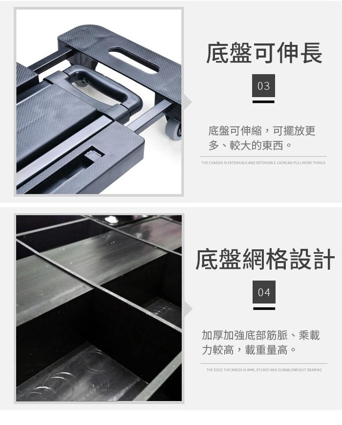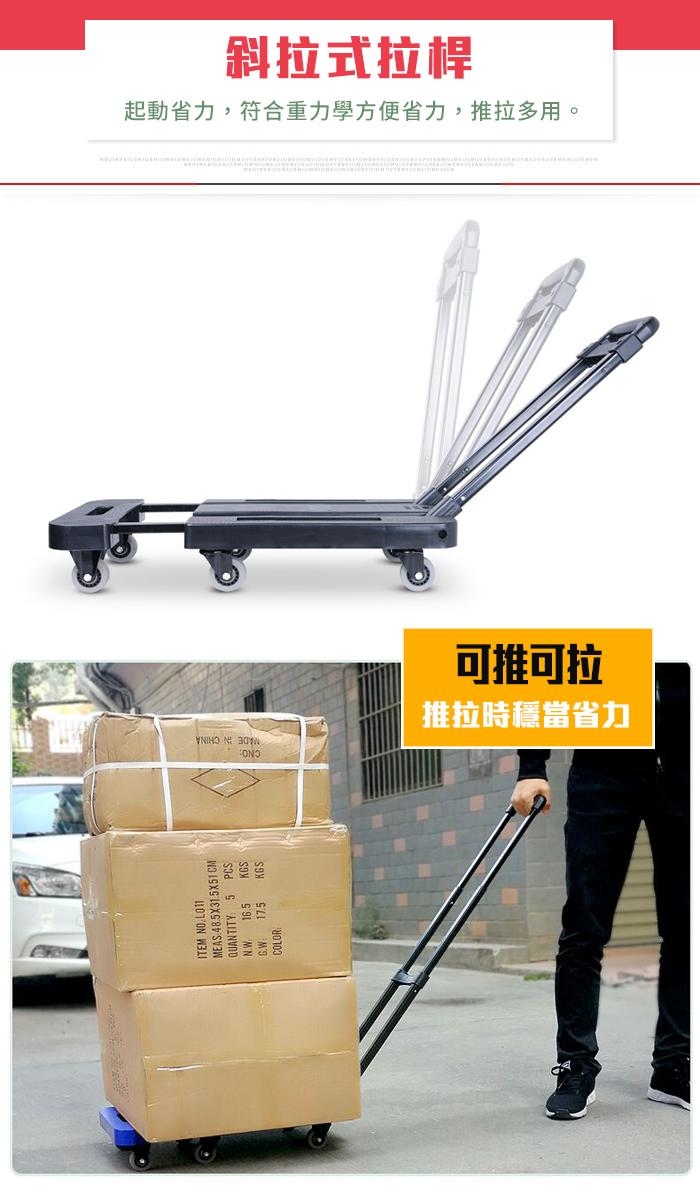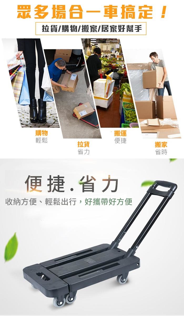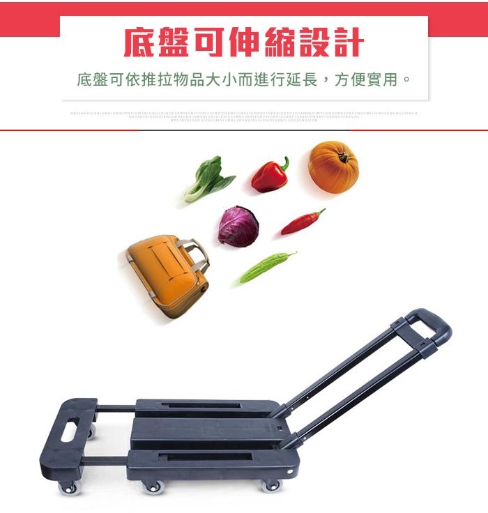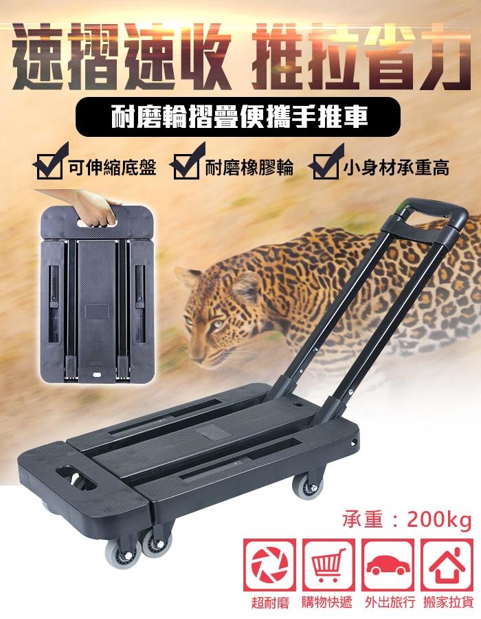 靜音便攜手推車,搬運行李、貨運,大小貨物一台搞定!搭載靜音大輪,更具備360方向輪設計,可隨意拖拉移動,行動不卡輪、不吵雜!智慧伸縮式加長底盤,可輕鬆置放大/小物件,承重力達200KG更實用~車板防滑設計,更可確保物品不易滑落~