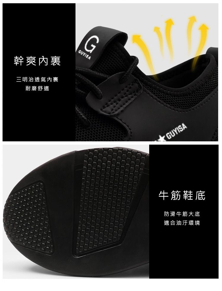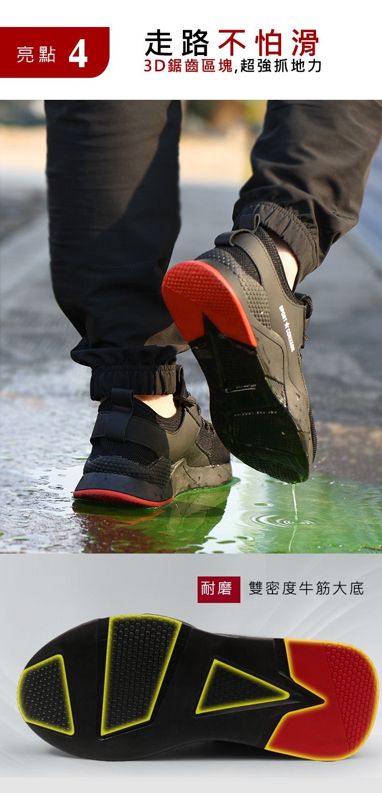 防滑鞋底:採用柔軟聚氯乙烯大底打造,工作鞋擁有深溝,即使在滑表面也能提供極佳的牽引力