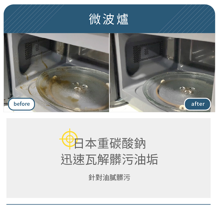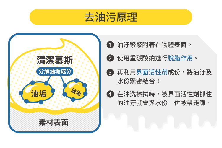 採用日本重碳酸鈉,迅速軟化油垢頑漬。