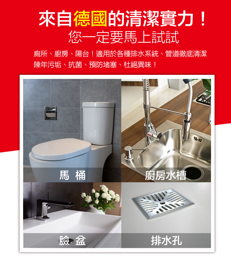 無論是清理水槽、水管、馬桶,皆可將汙垢帶走,再以水壓沖洗,異味一併帶走!