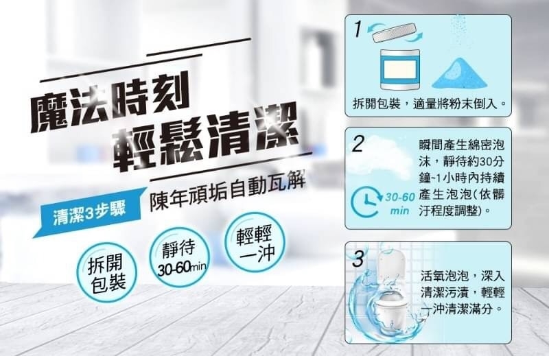 1️⃣拆開包裝,適量將粉末倒入。2️⃣瞬間產生綿密泡沫,靜待約30分鐘~1小時內持續產生泡泡(依髒汙程度調整)。