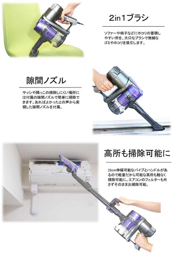 二合一超靜音充電式旋風吸塵機 全機僅重1.2KG極輕巧機身配以人體工學設計,適合長時間使用! 多角度旋轉刷頭可靈活轉向,就算是較難清潔位置,都可以輕鬆打掃 !13000Pa超強勁吸力,再以氣旋方式將空氣旋轉技術,從而帶出高速離心力將吸力再推高 !不需塵袋,易拆式可用水清洗設計,方便清潔及日常保養!磁石靠牆座,方便靠牆收納