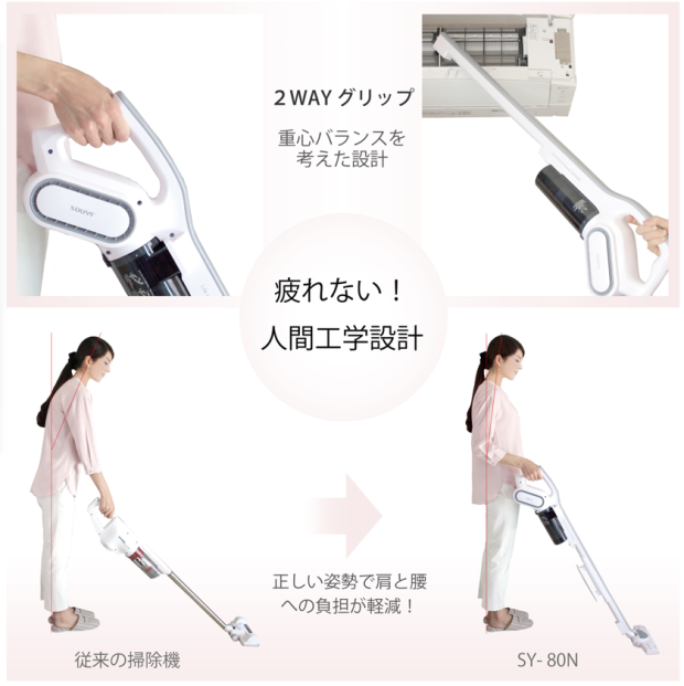 2. 人體工學設計,令你不用再彎低或俯身打掃,此設計能平衡重量減輕肩膀、腰部負擔,與使用傳統吸塵器相比姿勢更正確及舒服。