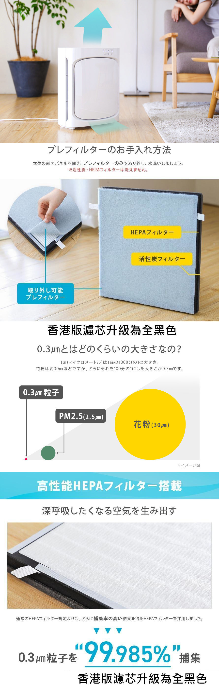 • 第二重 靜電HEPA濾網, 能有效隔絕空氣中99.985% 0.3um塵埃, 花粉等致敏原(PM2.5)