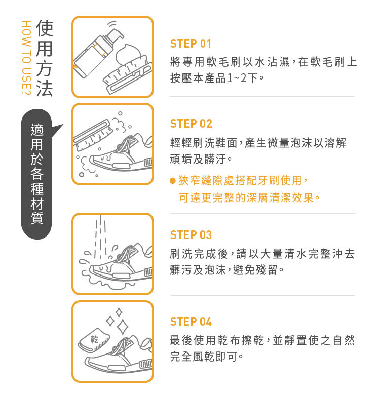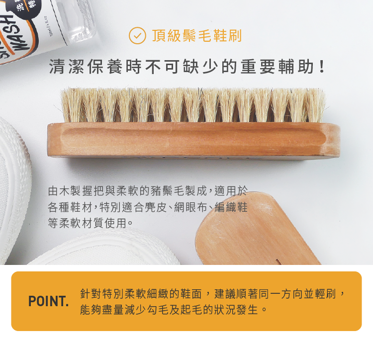 A:我們附贈的豬鬃毛刷,適合全鞋使用。但狹小縫隙處較難深入,可使用牙刷搭配刷洗。鞋底則可使用硬刷或洗衣刷以達到更完美的清潔效果。