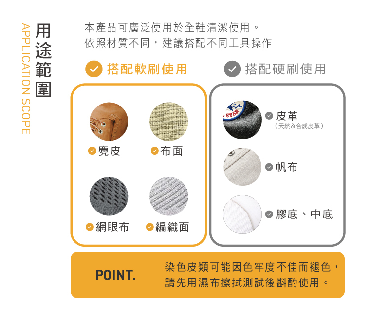 A:不建議使用於經染色加工的物件上,如特殊麂皮及染色皮革。使用前務必先於鞋子不明顯處做色牢度測試(用濕毛巾磨擦拭),確定不會掉色再進行清潔 ; 若會掉色請斟酌使用。