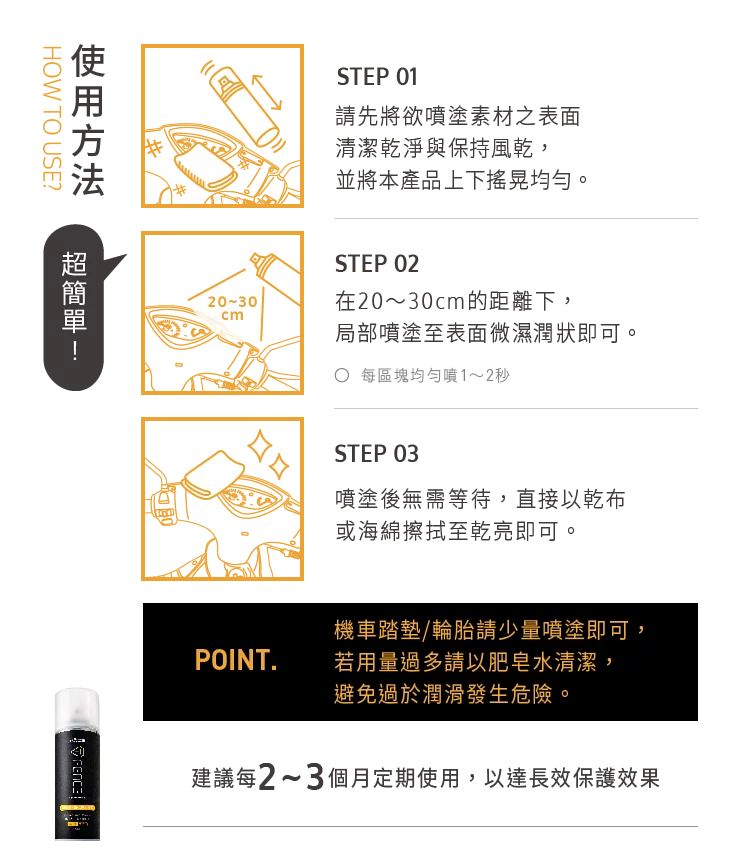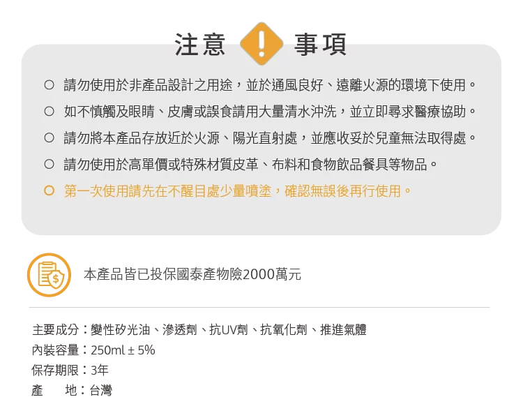 🔹主要成分: 變性矽光油、滲透剷、抗UV劑、打氧化劑、推進氣體