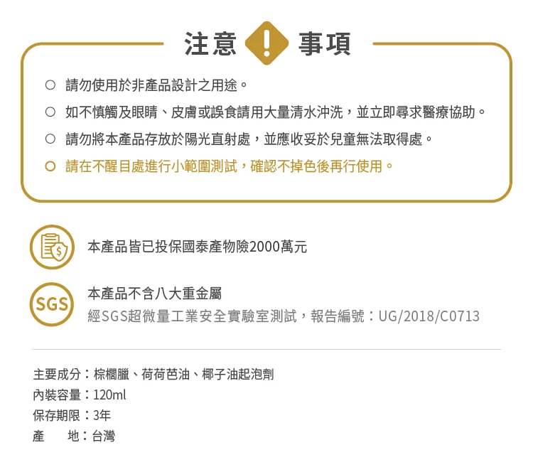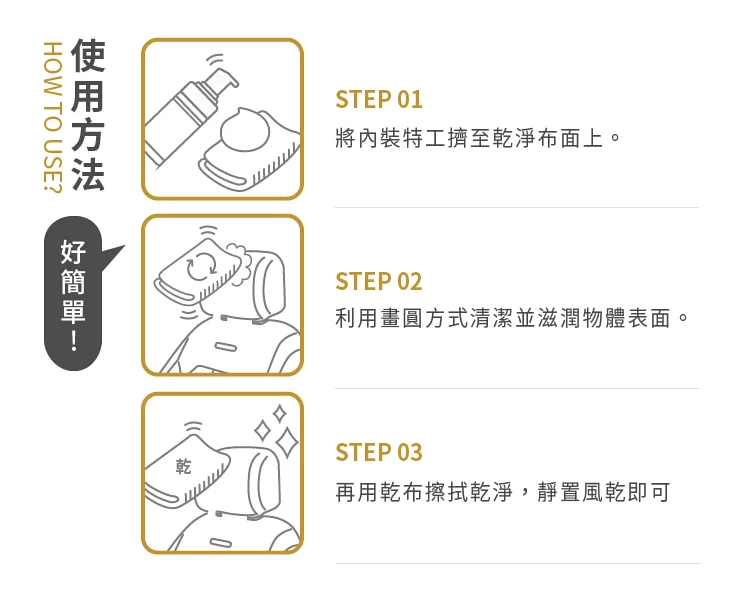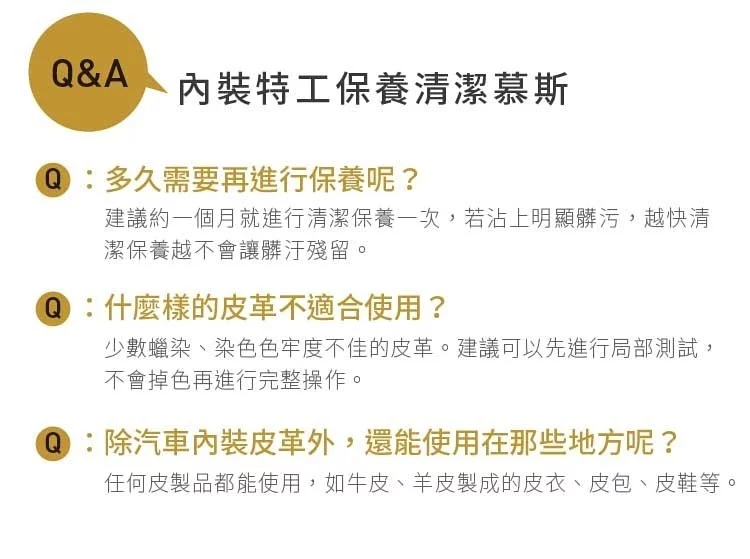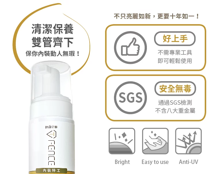內裝特工採用慕斯型泡沫,深層清潔徹底潔淨。添加荷荷芭油及巴西棕櫚蠟,同時保養讓光澤再現。通過SGS檢測,不含八大重金屬安心使用。任何皮製品都能讓它立即回春!