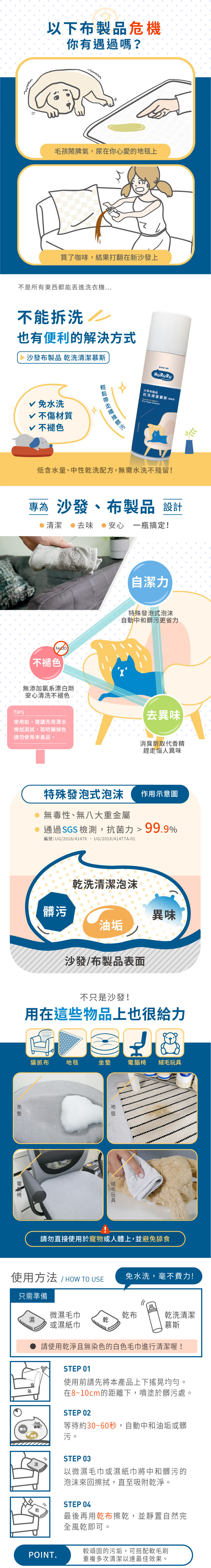 完全的中性乾洗配方, ​採用發泡式泡沫,自動中和髒污更給力! ​對於難以清潔、無法接觸水分的地毯、沙發、絨毛娃娃, ​簡單帶走髒污不傷它半分。 ​更添加消臭劑,一併消滅惱人異味。 ​願髒污不與你同在!