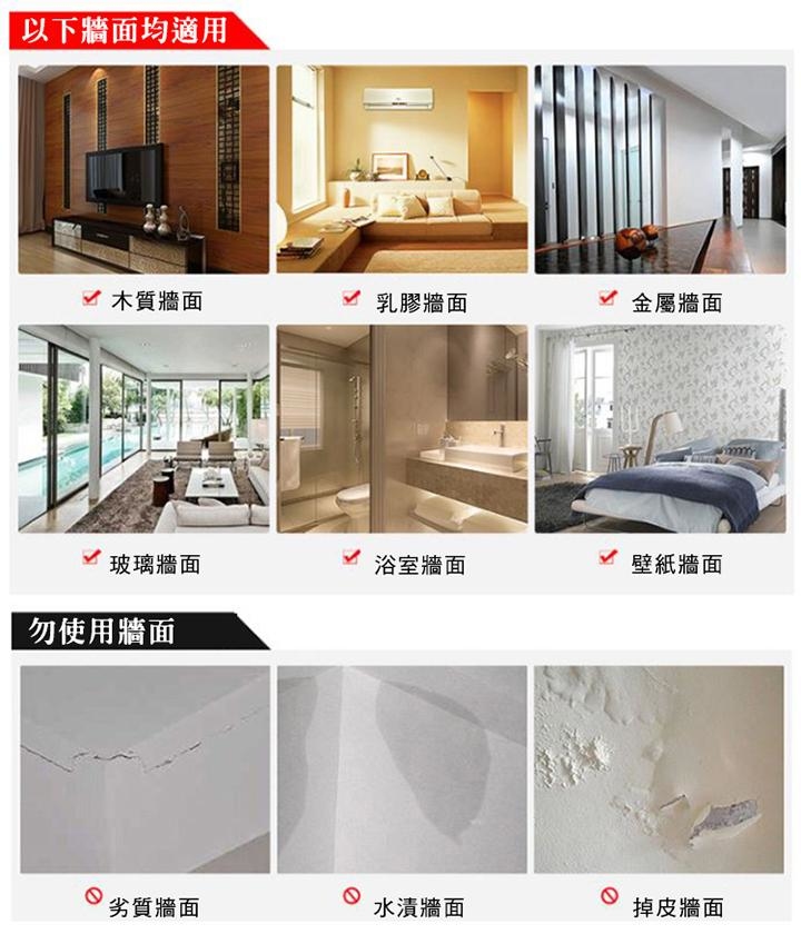 ★ 不建議使用在壁紙、粉牆、灰泥牆、石材等凹凸不平、粗糙易剝落的牆面。