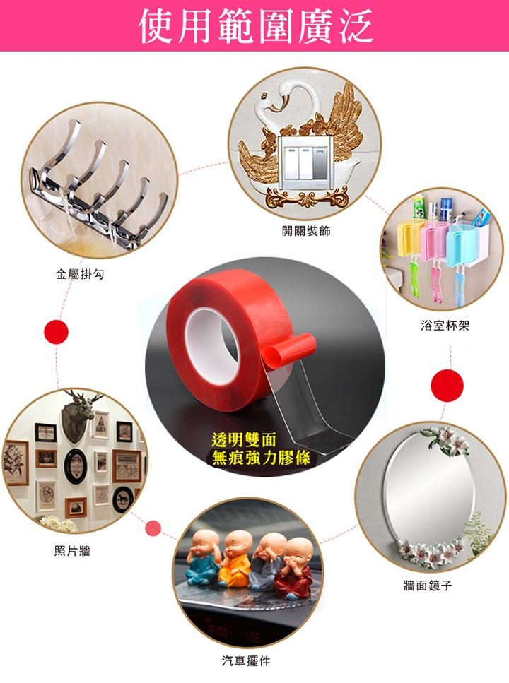 強力黏貼無痕,透明貼膜,秥上完全看不見,撕下來又不留膠,簡單又方便!適用於各種材質,可防水、可耐高熱,黏性超強,服貼性一流,想貼哪就貼哪,即使不平整的表面也可以填補黏貼,可自由裁切,貼上去完全看不見,撕下來無痕不殘膠好清理!!超讚超實用,家中必備。