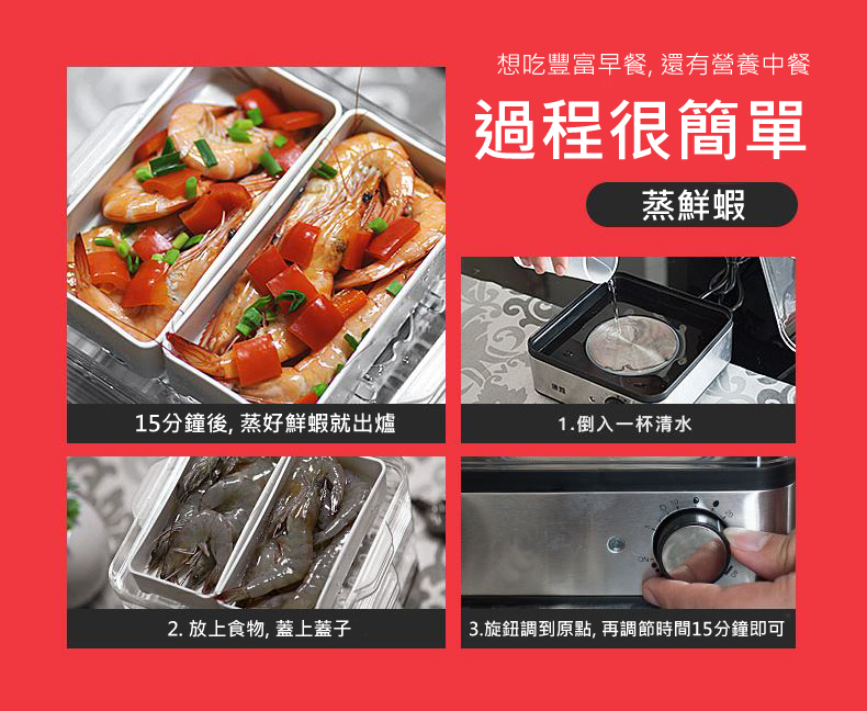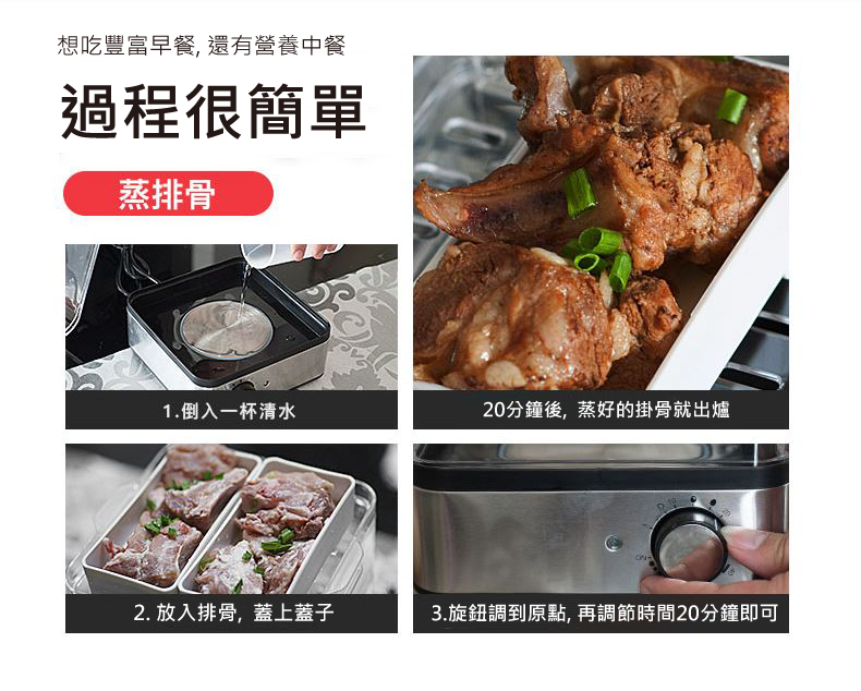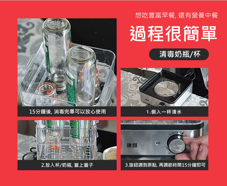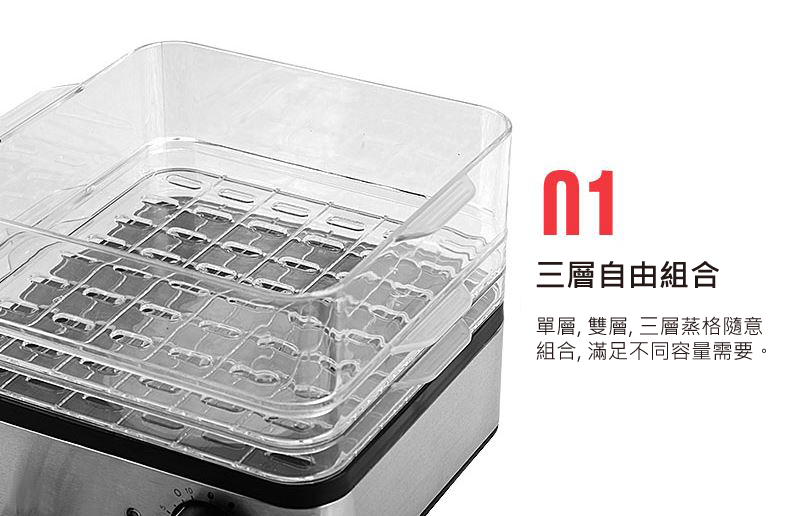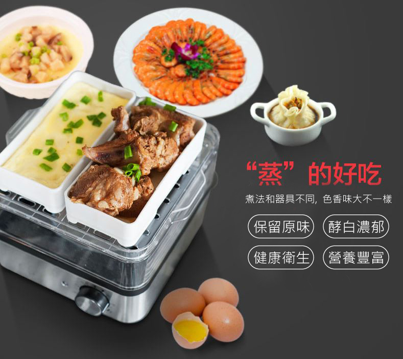 3層透明可拆蒸格,40分鐘時間掣及滴滴聲提示,可疊合節省空間,合蒸煮多款食物,營養不流失,方便健康!可蒸煮食物或消毒煮食用具!