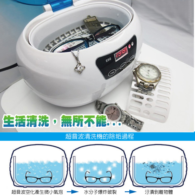 ● 日常使用的物品 (如金銀首飾、眼鏡、剃鬚刀、手錶、梳子、假牙等等) 往往藏有很多細菌污垢難以清洗,用電動超聲波清洗機清洗效果顯著,有效清潔死角污漬