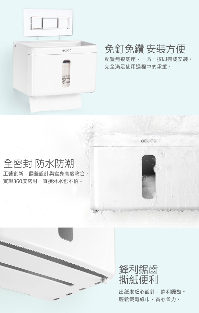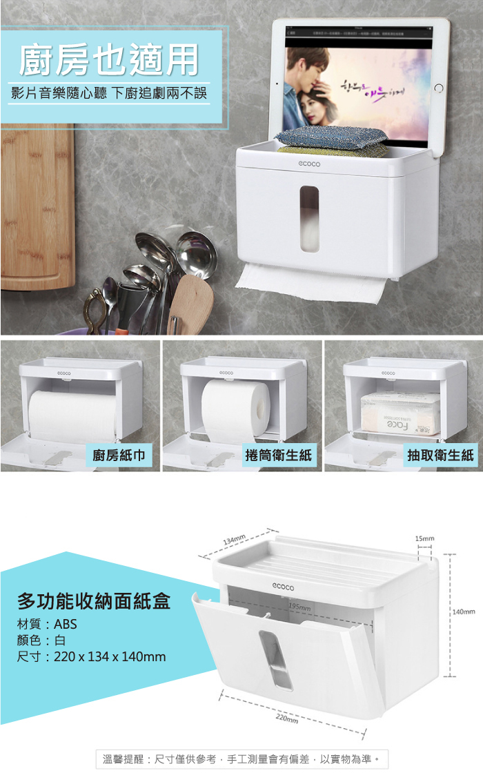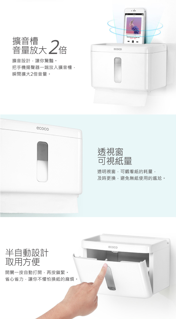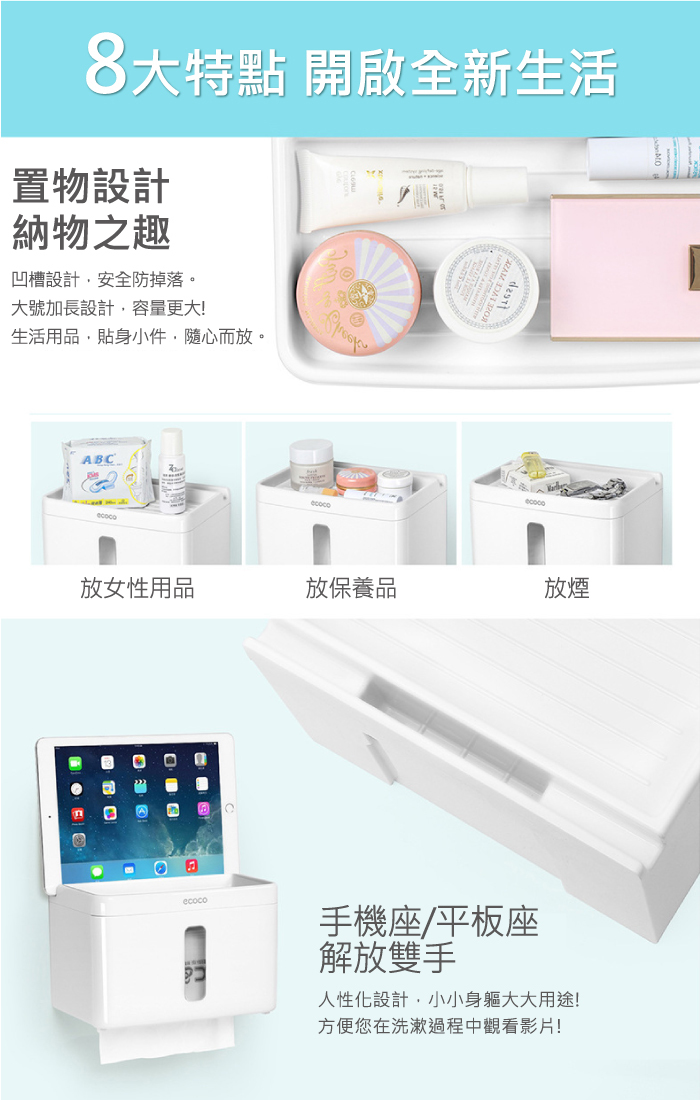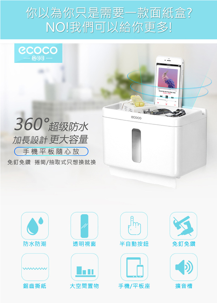 防水多功能衛生紙置物盒,兼具置物、手機/平板卡座的功能!追劇聽歌隨心所欲 ! 360度超級防水防潮 ! 免釘免鑽,無痕底座安裝超方便!高承重超安心 ! 透明窗可透視衛生紙消耗量,多種貼心設計都是為了你 !